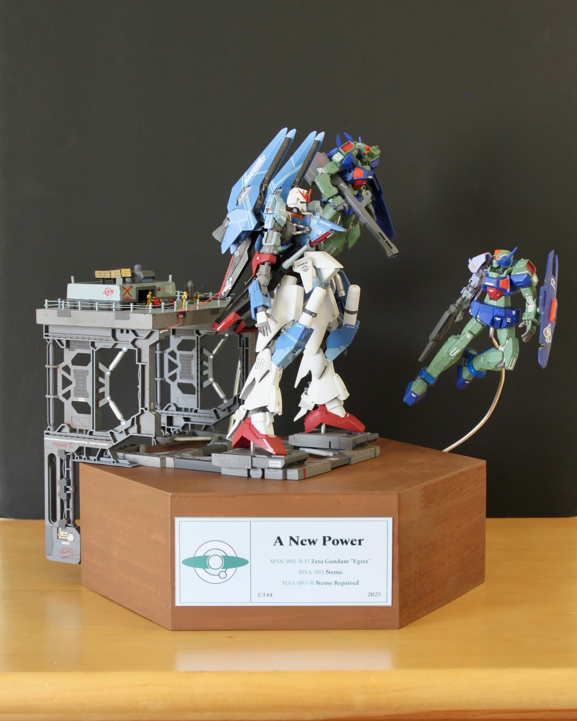 “A New Power” depicts the MSN-006-R:D Zeta Gundam “Egret” on a captured Titans maintenance platform with two battle-worn MSA-003 Nemos launching. The repaired Nemo, piloted by an ex-Zeon ace, gazes at the Zeta in admiration, recognizing its potential to turn the tide of a losing war.