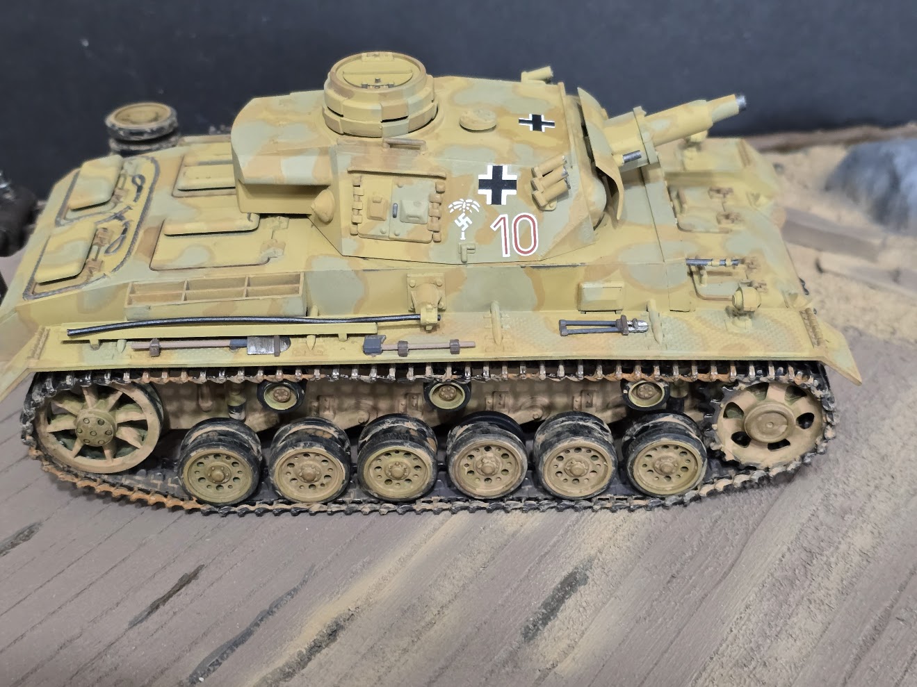 Hi, I used ICM paints for the first time to paint this Panzer. Before applying the ICM paint, I primed the tank with Mr. Finisher 1500 brown on the top hull and Mr. Finisher 1500 black on the lower hull. The ICM paint was thinned 50% with distilled water for my airbrush. The camo pattern was hand painted with ICM paints. Their paint drys very flat. Tamiya semi-gloss thinned with X20A was used seal the paint and add some depth to the finish.