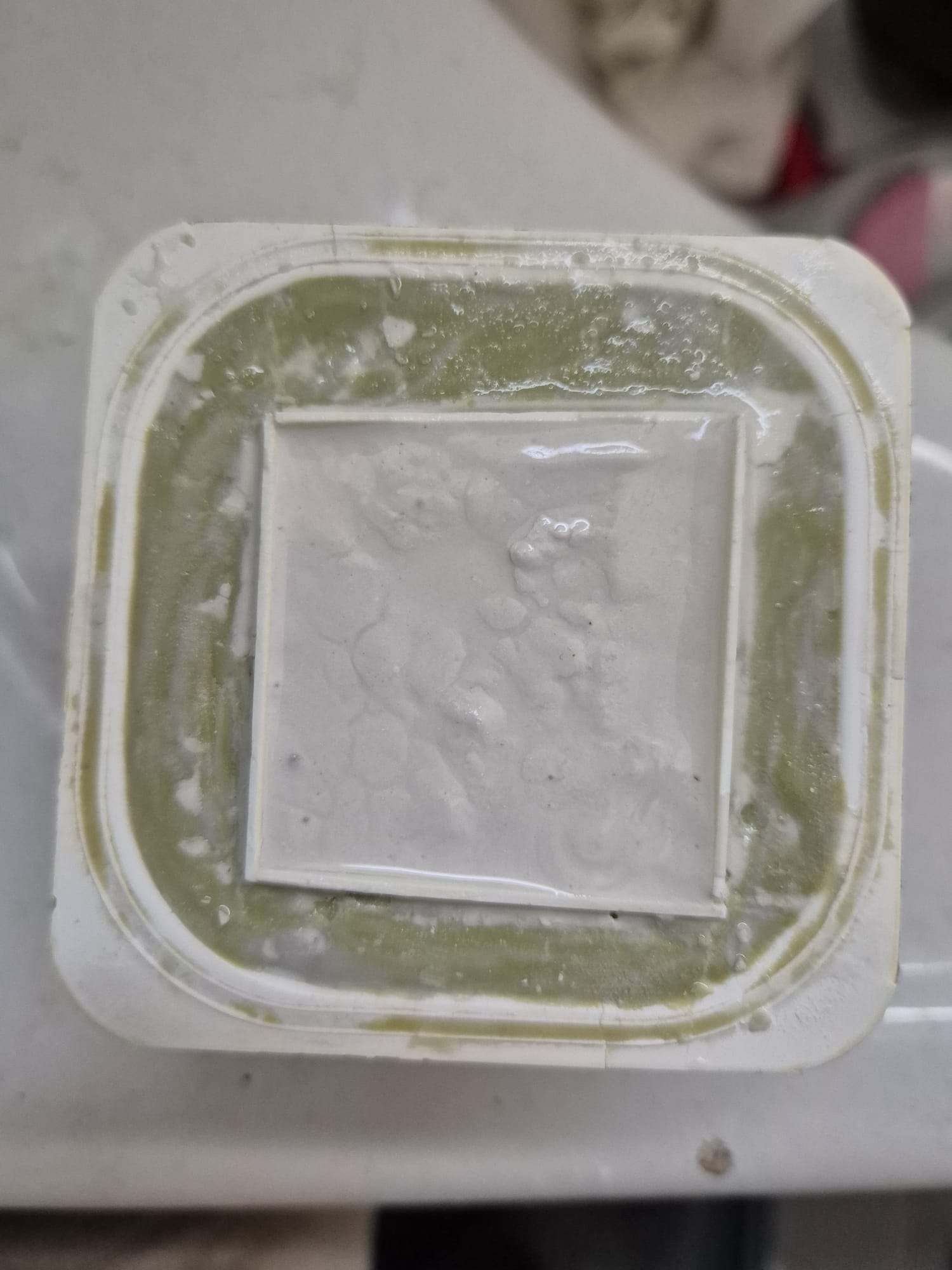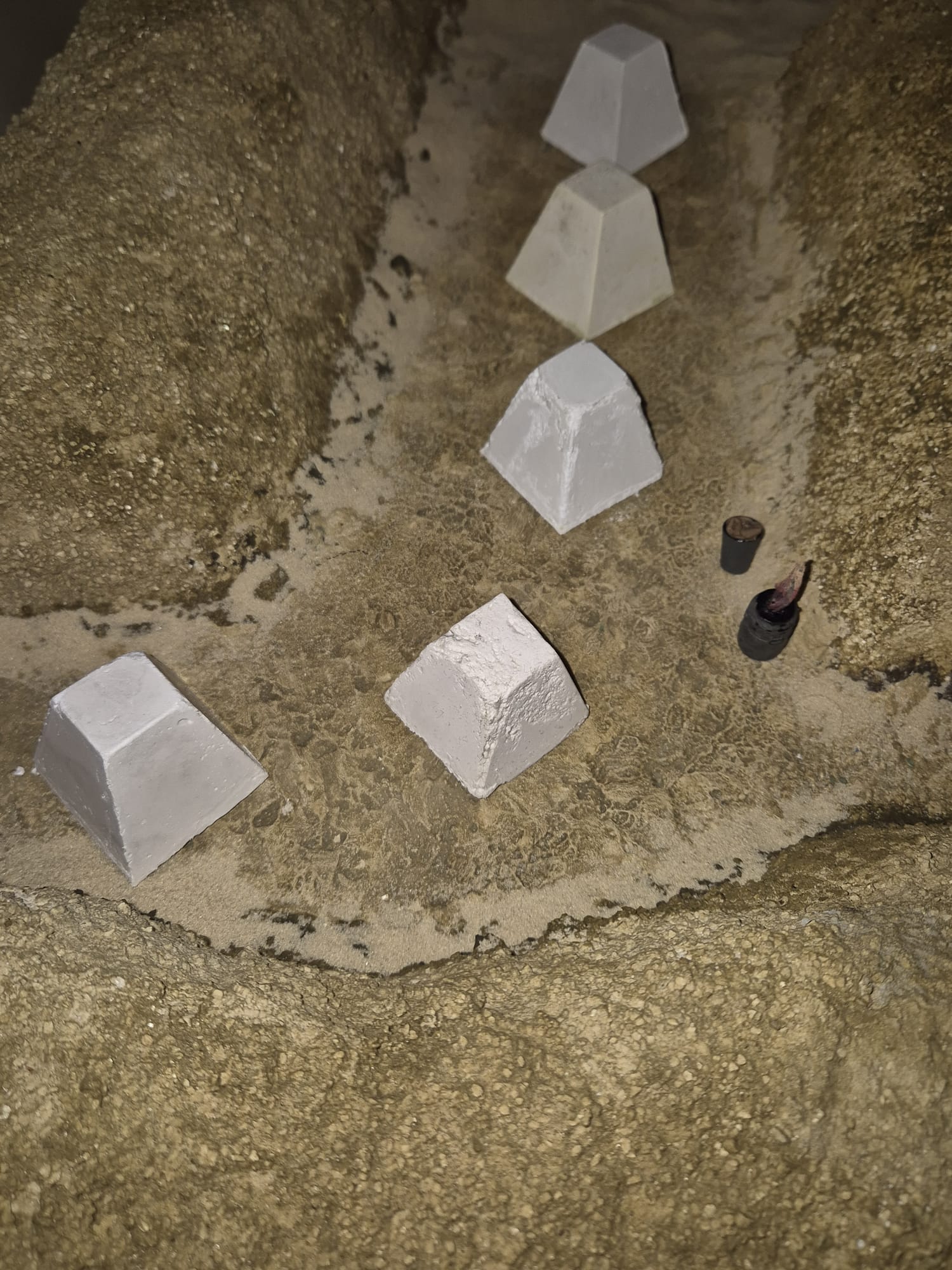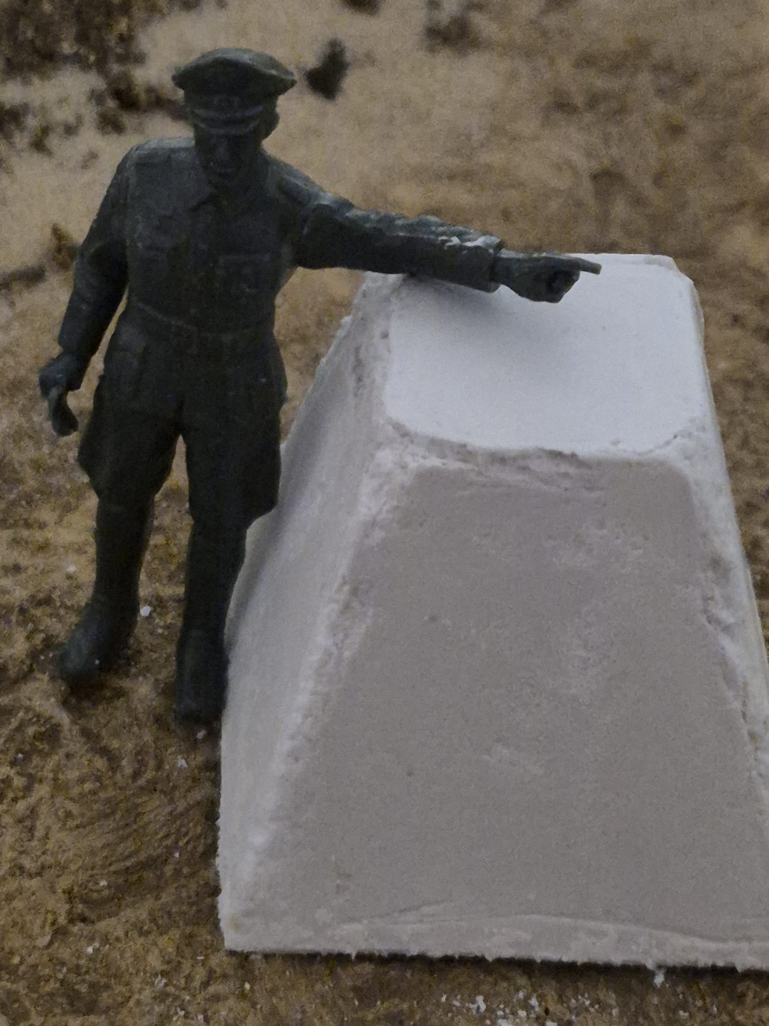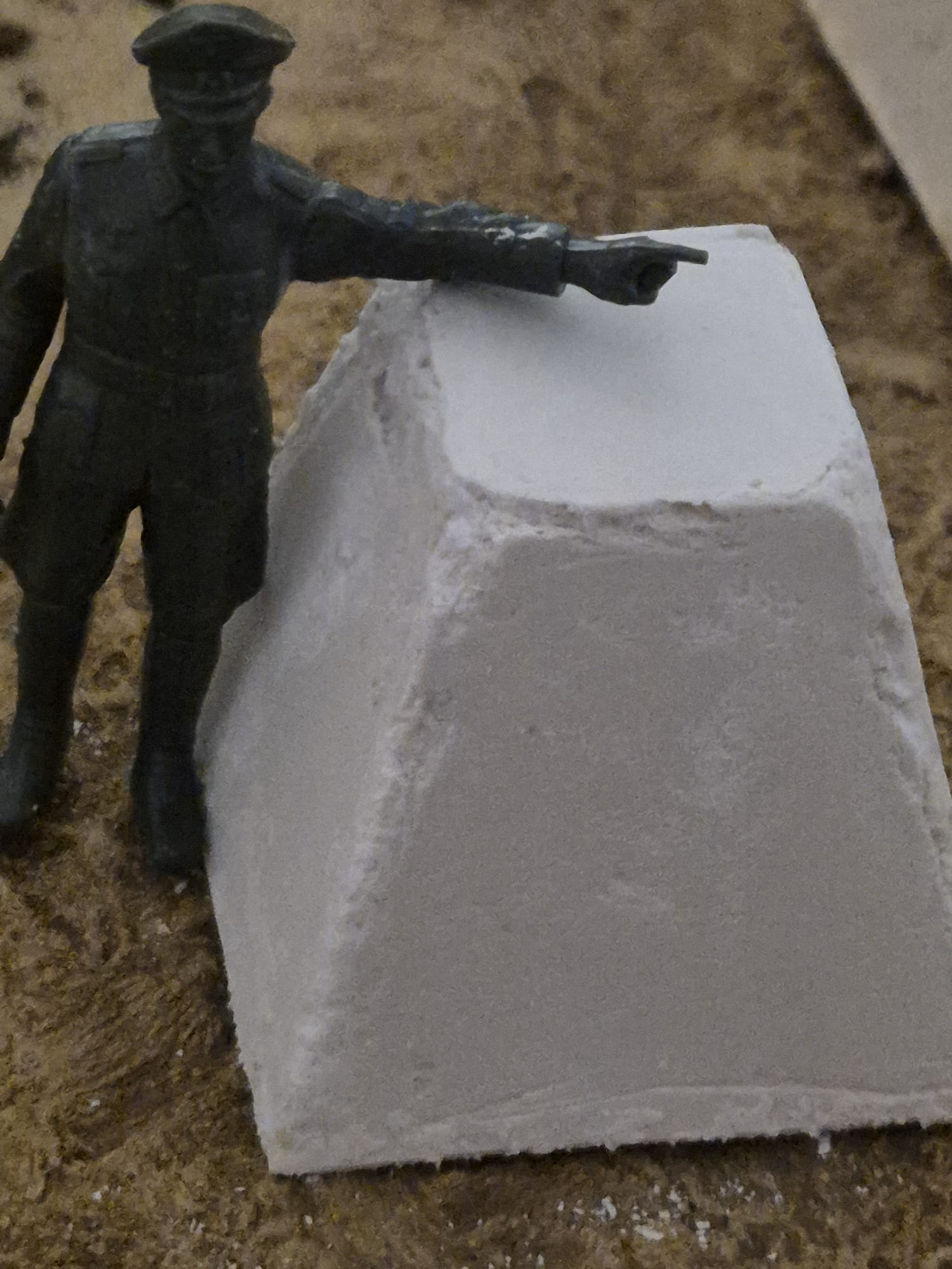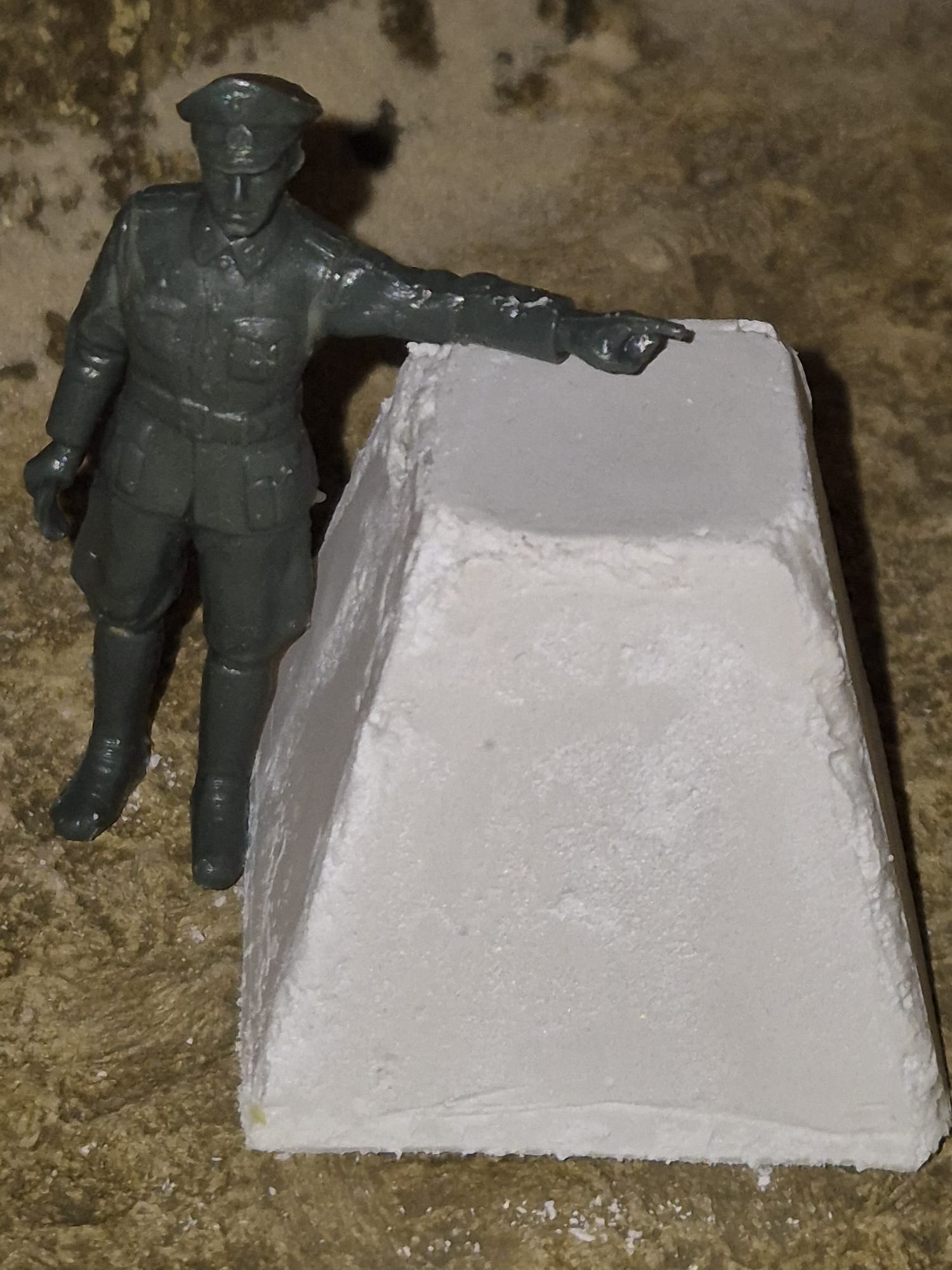I form them irregularly on purpose, with some edges smoothened by erosion or having been hit by ammunition. The trick is to insert into the mold some talcum prior to the pouring of plaster mixed with water. Once completely dried (approx. 3-4hrs.) I carefully cut along the edges of the mold and tap the bottom of it allowing the hardened item to slide out, and voila!