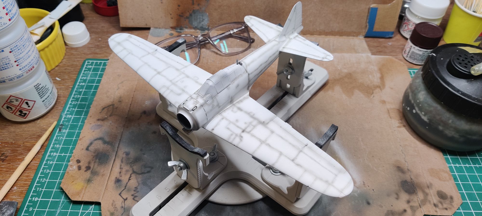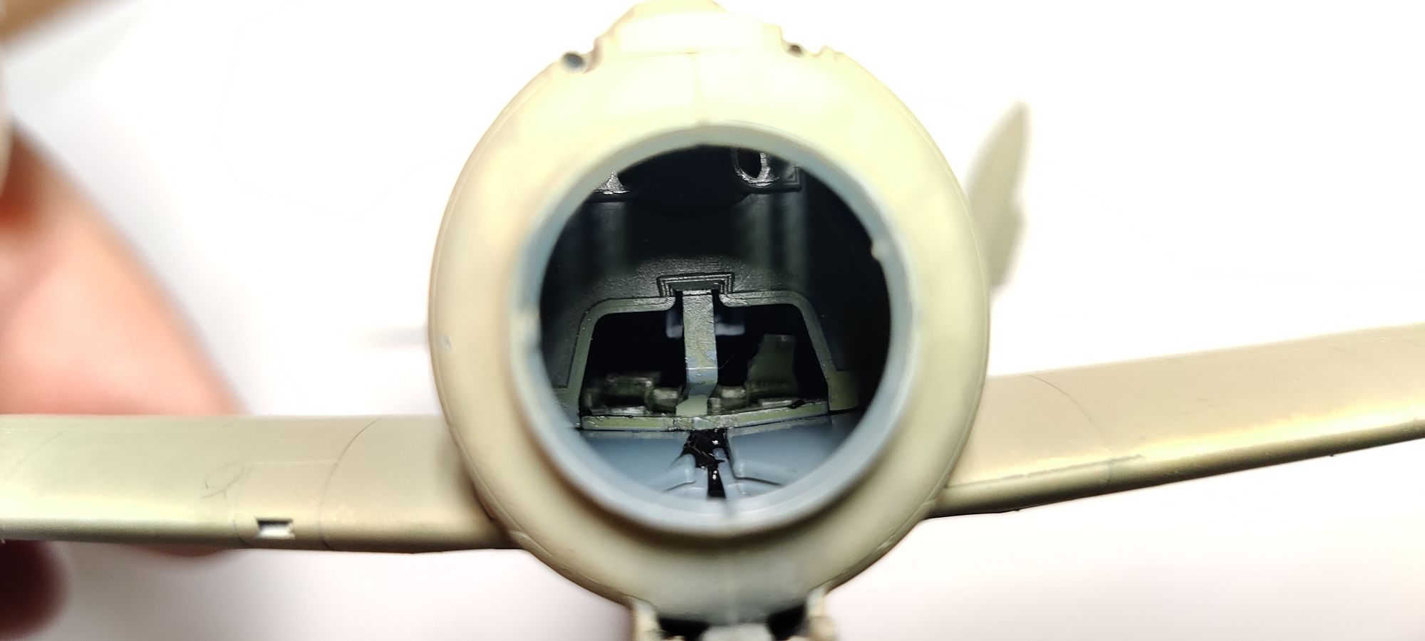 A cautionnary tale : the way eduard cockpit tub is build, it leaves gaping holes behind/under the instruments panel. With the nose still open ( I will attach the engine and engine cowl later ) I tought I’d “shishkebab” the model for easier handling during paint.