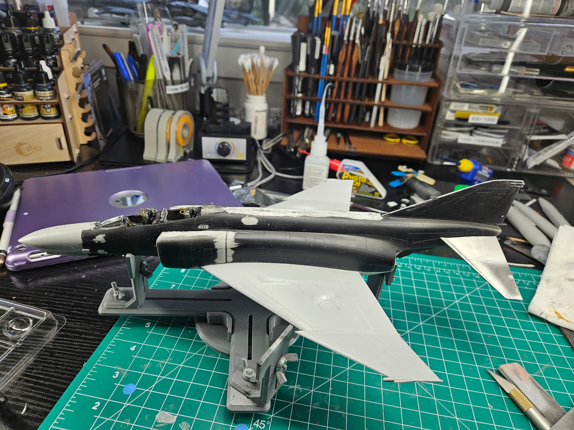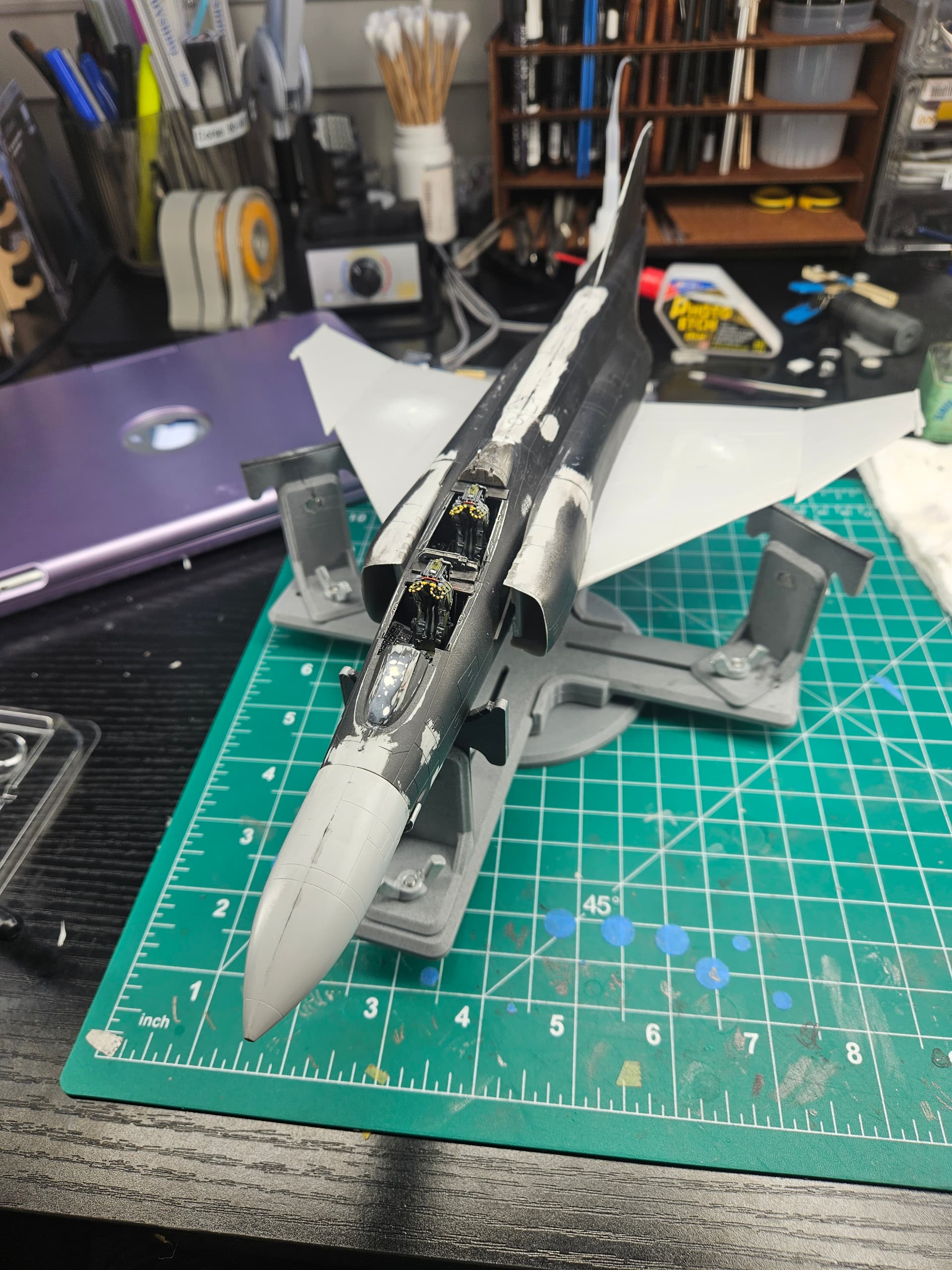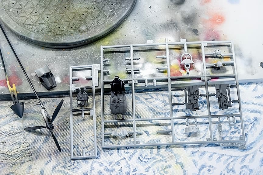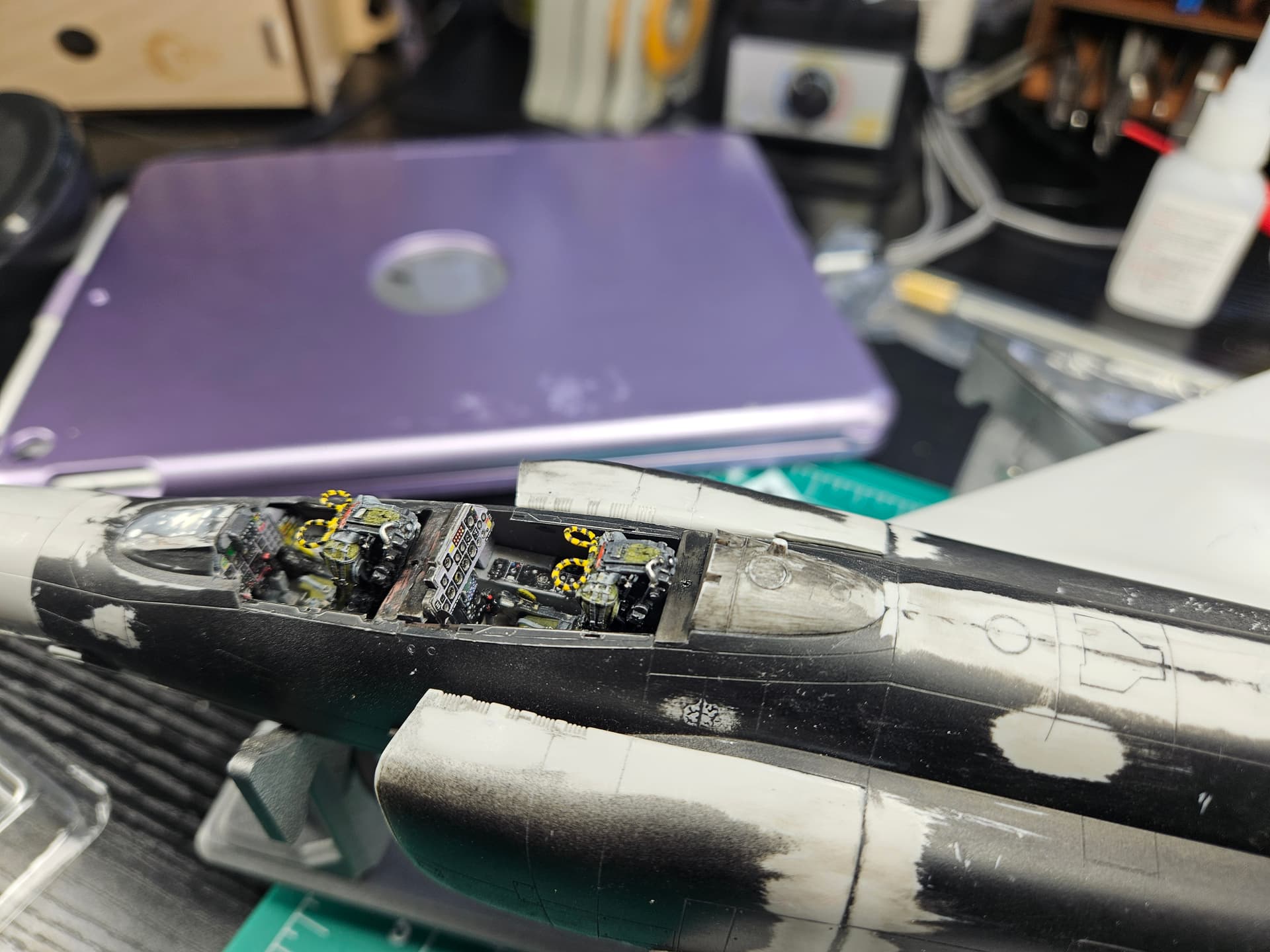 I finally fixed the engine cowl, then glued it and primed/painted. The aftermarket open cowls could only be glued once the engine and cowl were in place, meaning it was best to paint the fuselage in two steps. prime body, camo ; glue engine, glue engine cowl, glue opened cowls, prime cowl, paint. Was a bit nervous the blue-black color would spill over the camo, but for once I didn’t do a mess.