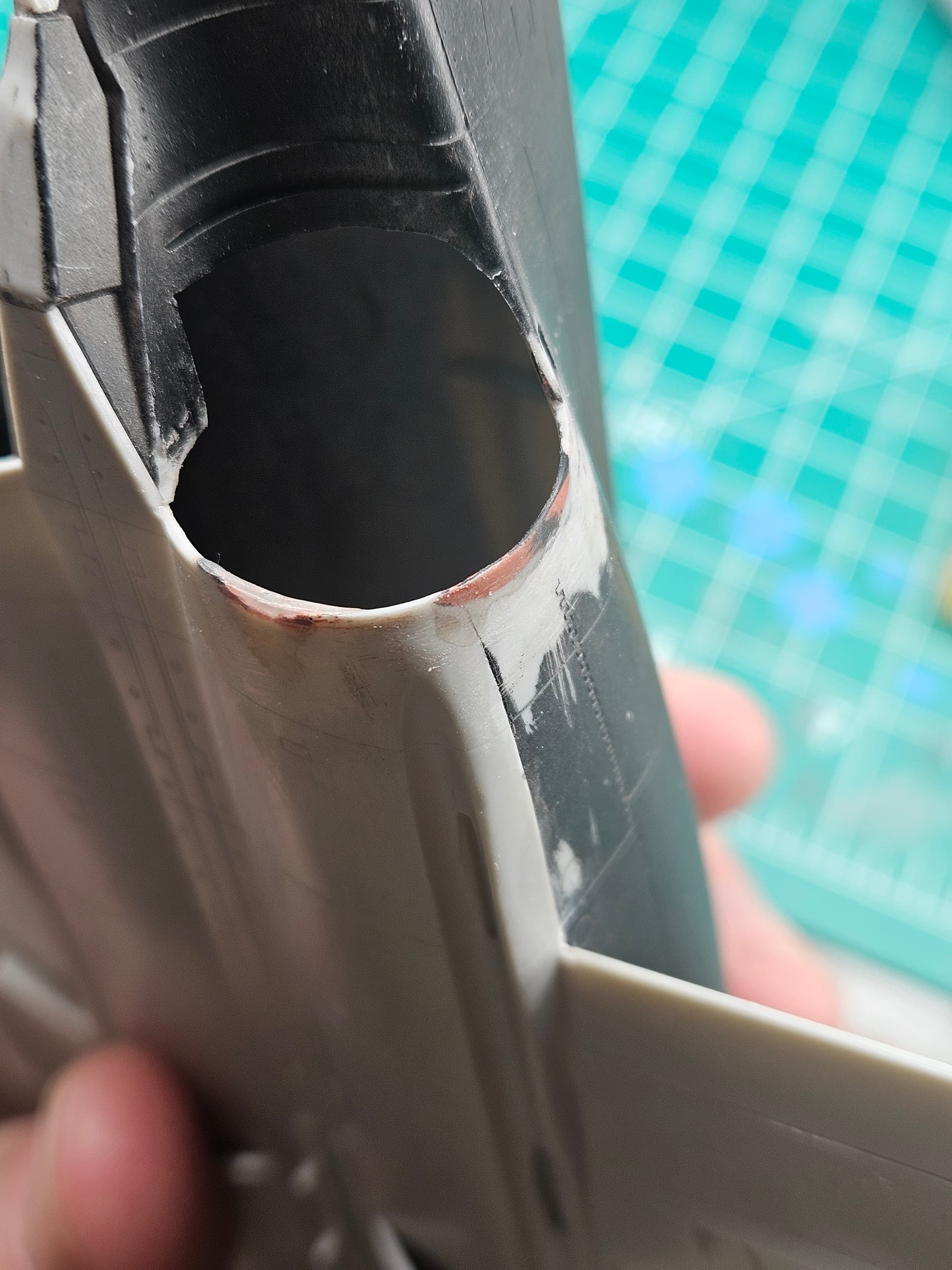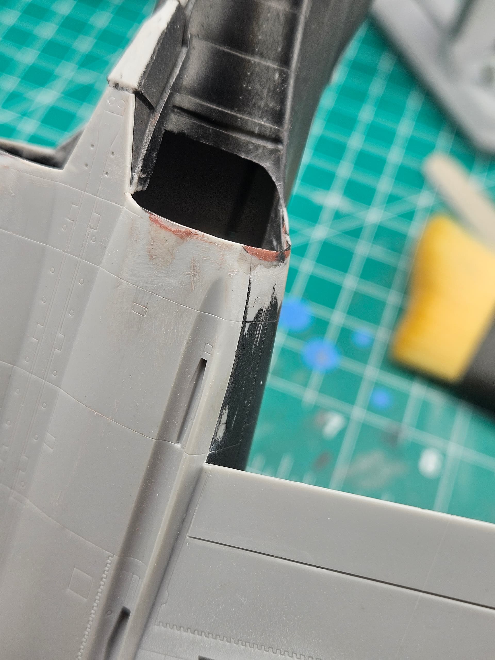 I had to get creative with Bondo, super glue and UV resin to fix the bites out of the plastic my tools took when trying to remove the structure that was deep inside the fuselage. It doesn’t look like much, but it was a pill to get right as there was nothing to support the patch so it kept crumbling/cracking.