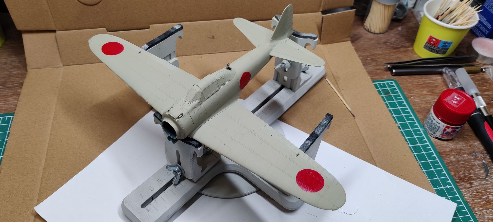 The mask failed just a tiiiiiny bit, especially at the bottom of the fuselage hinomarus, but I think I should be able to sand the excedent away when it’s dry enough. As mentionned the hinomaru ended up a bit too thick but they didn’t kill the rivets details too much as far as I can tell.