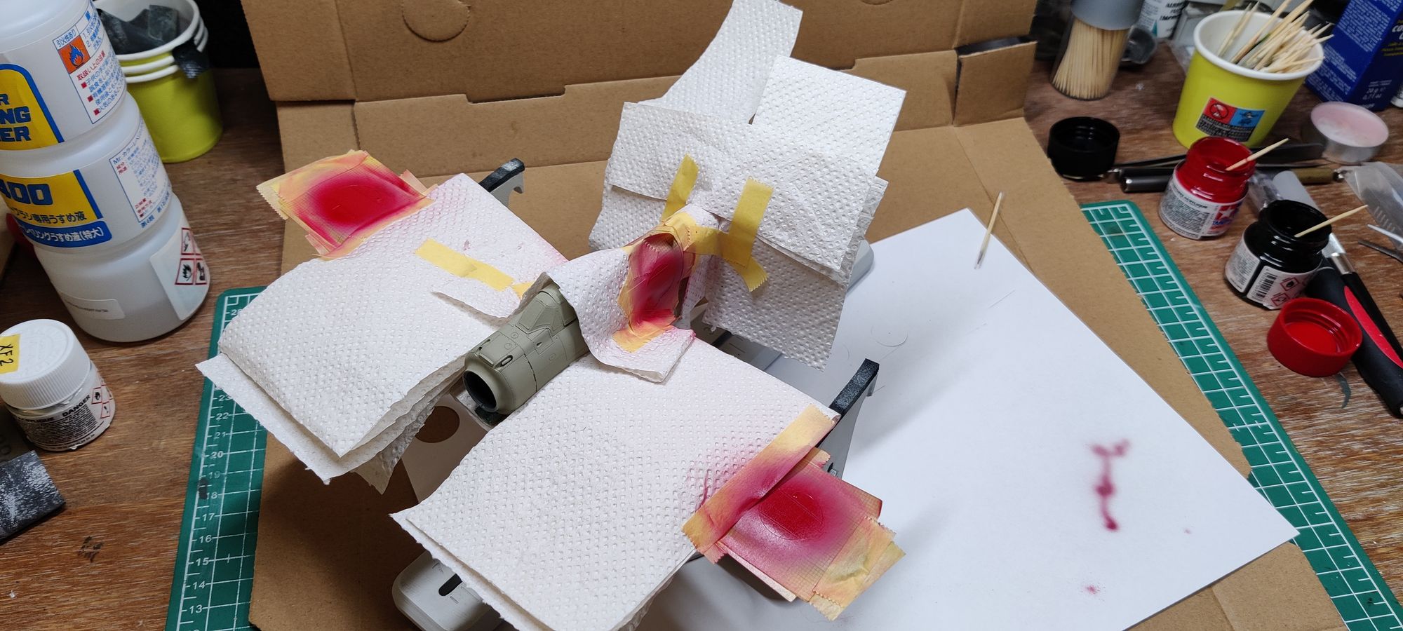 I started with a quick camo spray to try and seal the edges of the masks, then I went XF2 white to provide a clear base, then I had the bad idea of wanting to marble just a little bit which just added arguably unnecessary thickness, and finally X7 gloss red for the final color ( x7 is a little richer than xf7 imho )