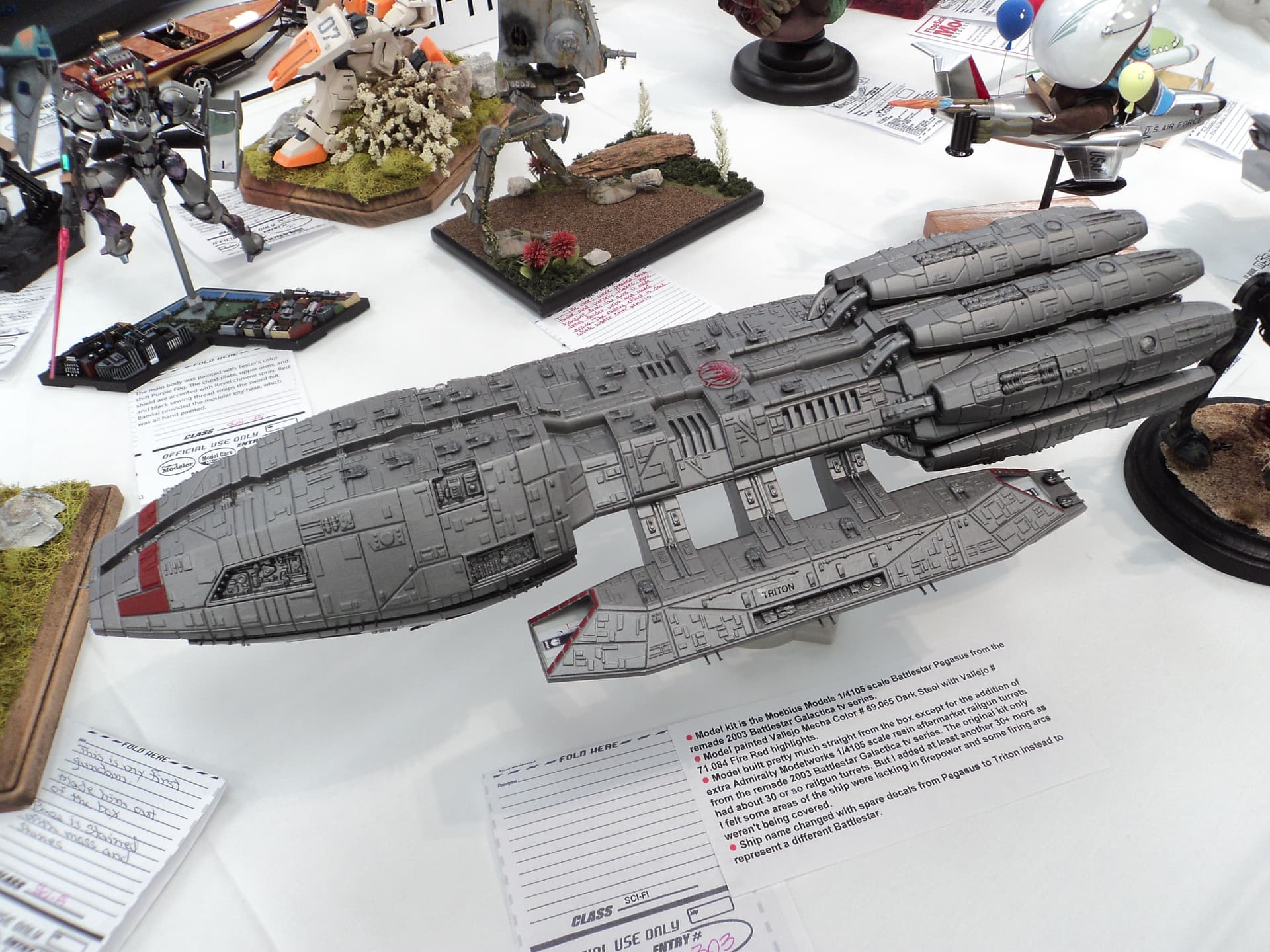 The Battlestar Pegasus box on the shelf is empty somewhat as I have already built the kit. There’s just some misc. leftover parts in there. But anyway, I built the Pegasus kit which I changed the name of it to “Triton” and added more gun turrets to it. Here’s a sample pic of it when I took it to a contest last year.