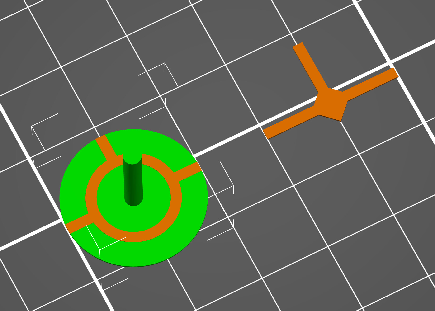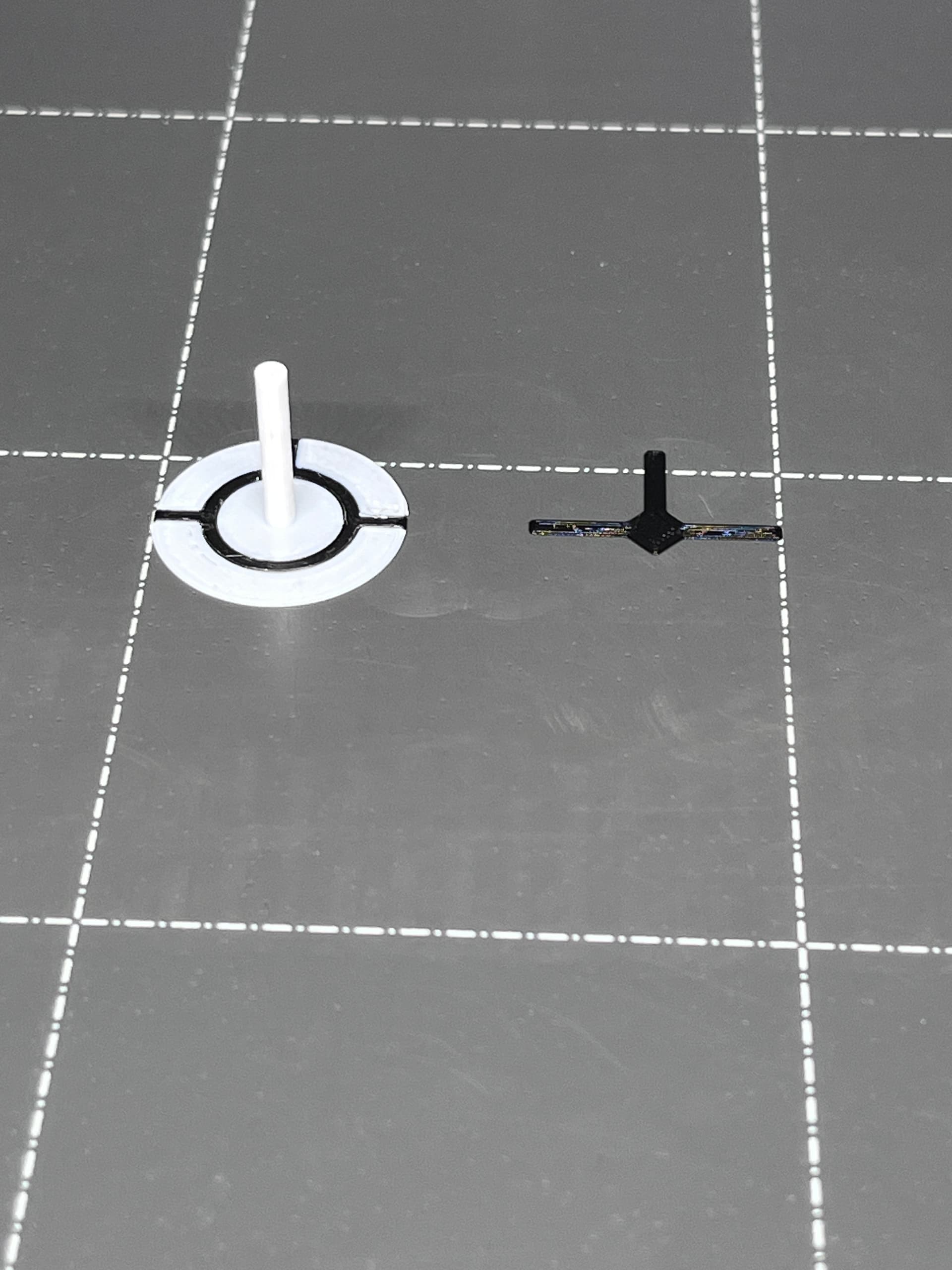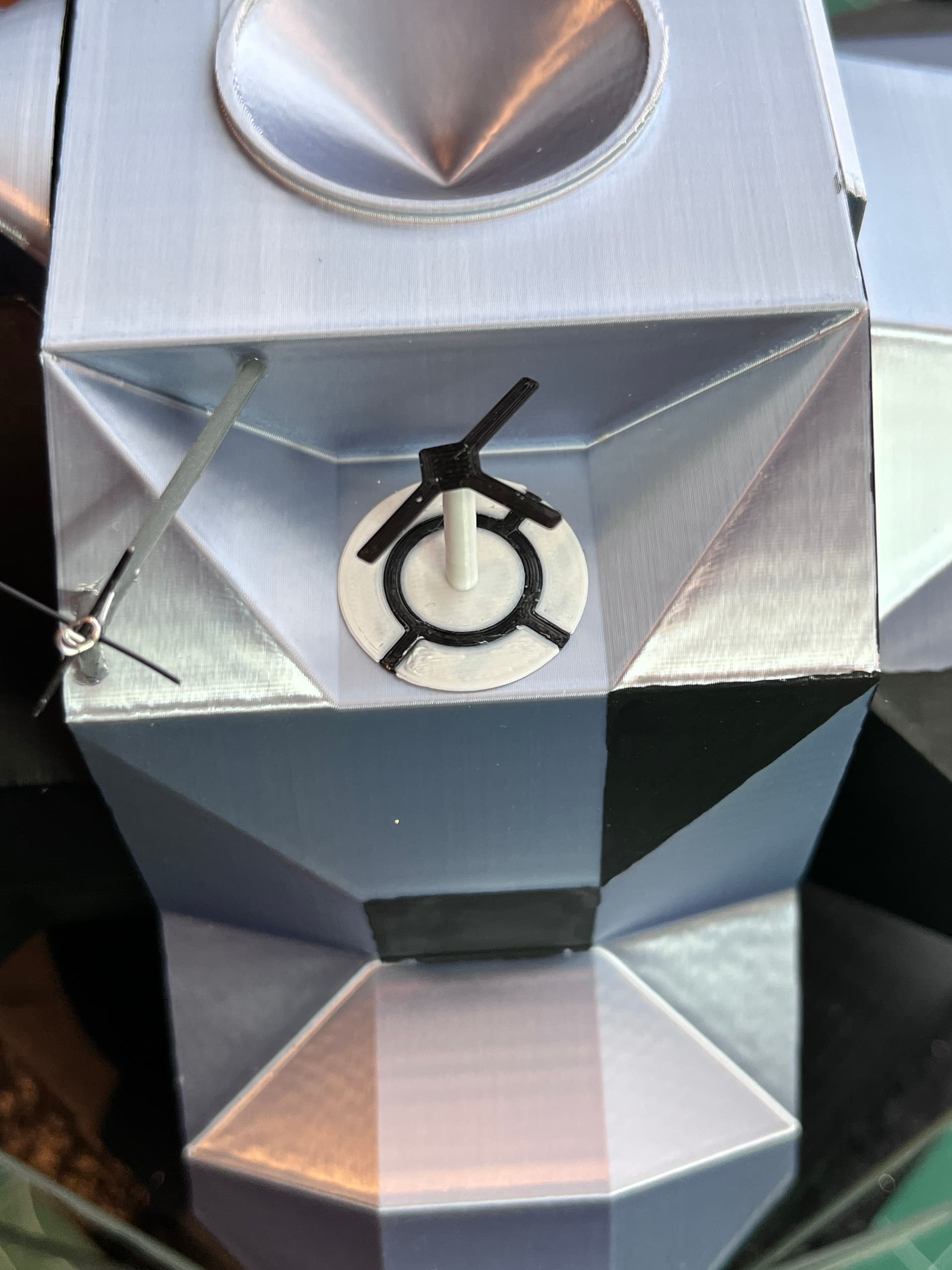 The last part is the docking target. Since it has a thin plate with black and white I chose to print this and not attempt painting it. There are two multi-color print techniques I use with a single print head printer. The horizontal color change is the easiest. This one required printing two parts, one next to the other. In the slicer I sliced the black parts and saved those for printing. Using the small 0.25mm nozzle I set the first layer height to 0.15 and the remaining layers to 0.10mm. The black parts are 0.25mm thick. With the black parts still in the slicer I then brought in the white part and set that in place directly over the black parts. When you are sure the white parts are positioned exactly (no daylight between the parts), highlight and remove the black parts. Now you can slice and save the white parts. If your slicer has elephant foot compensation, you should turn that off so the parts melt together. Here is an image in the slicer with both black (orange) and white (green).