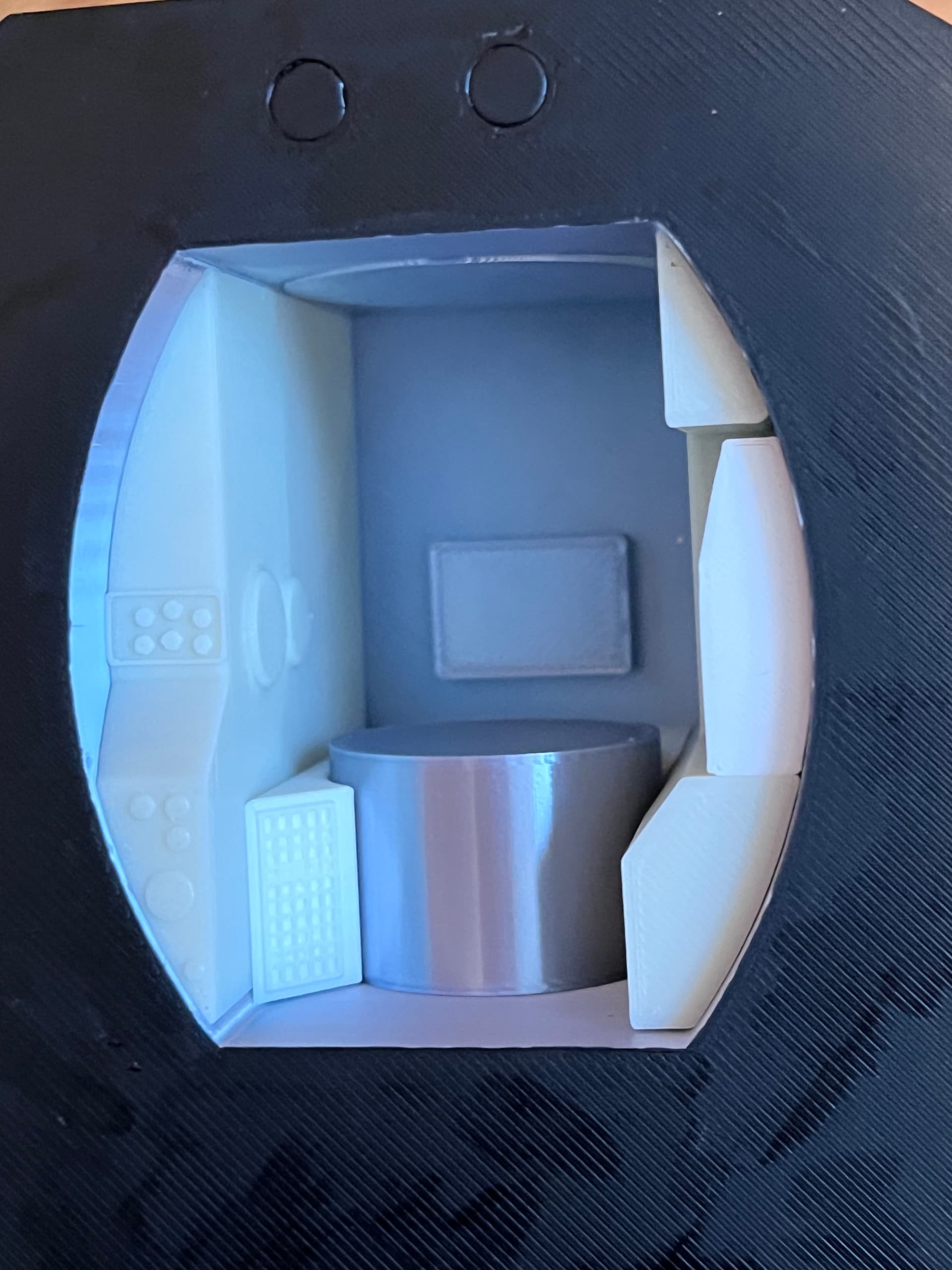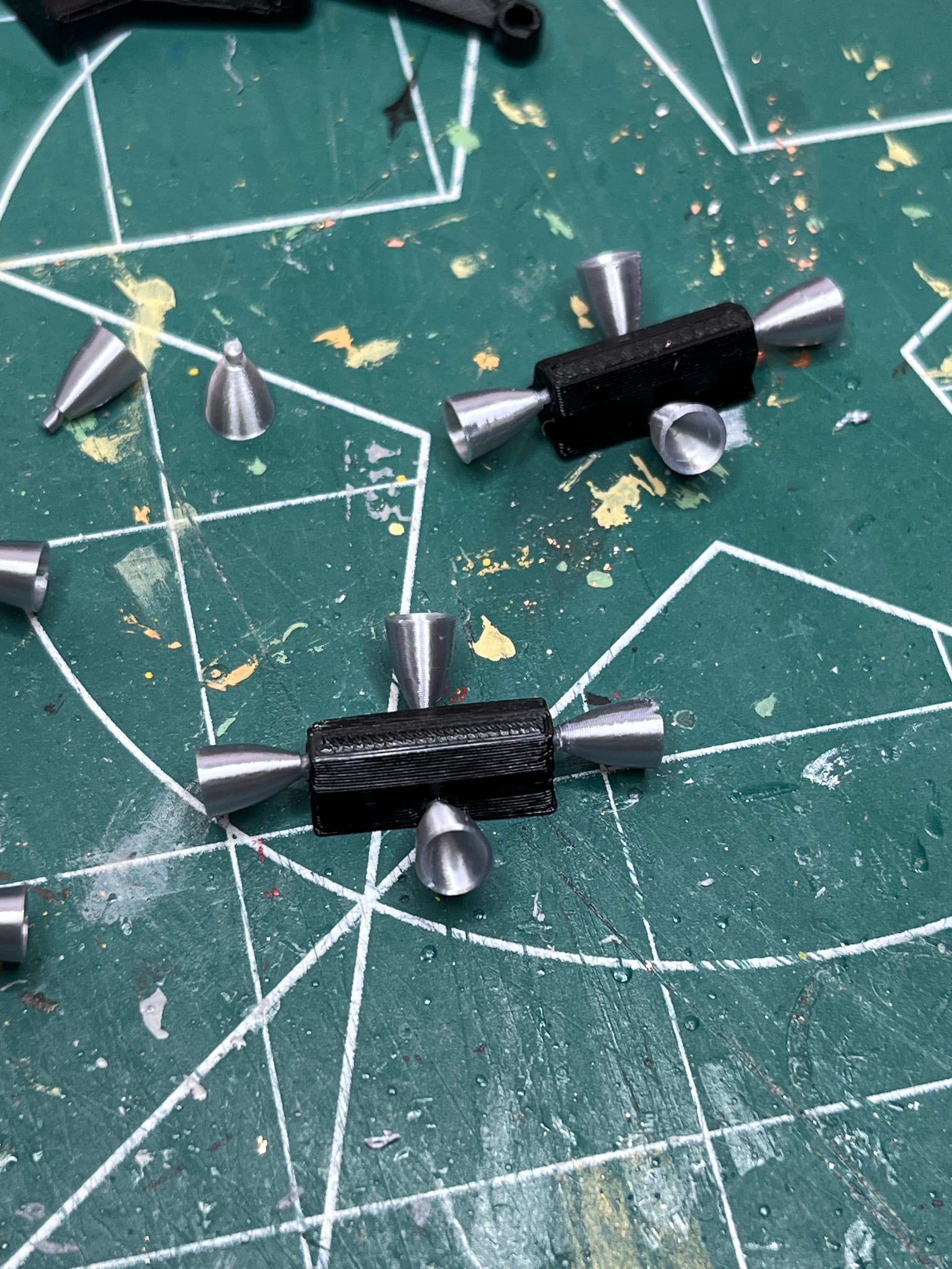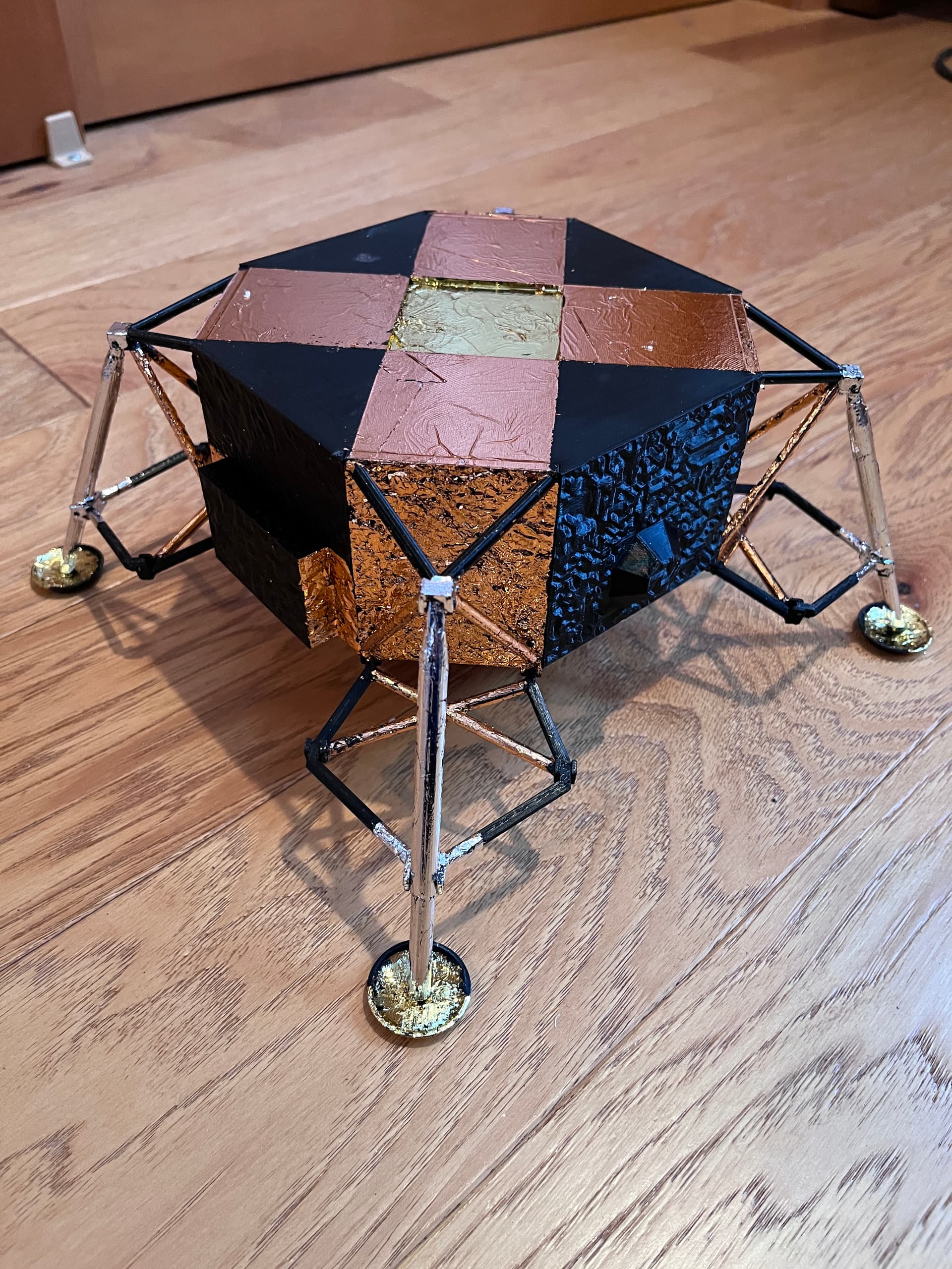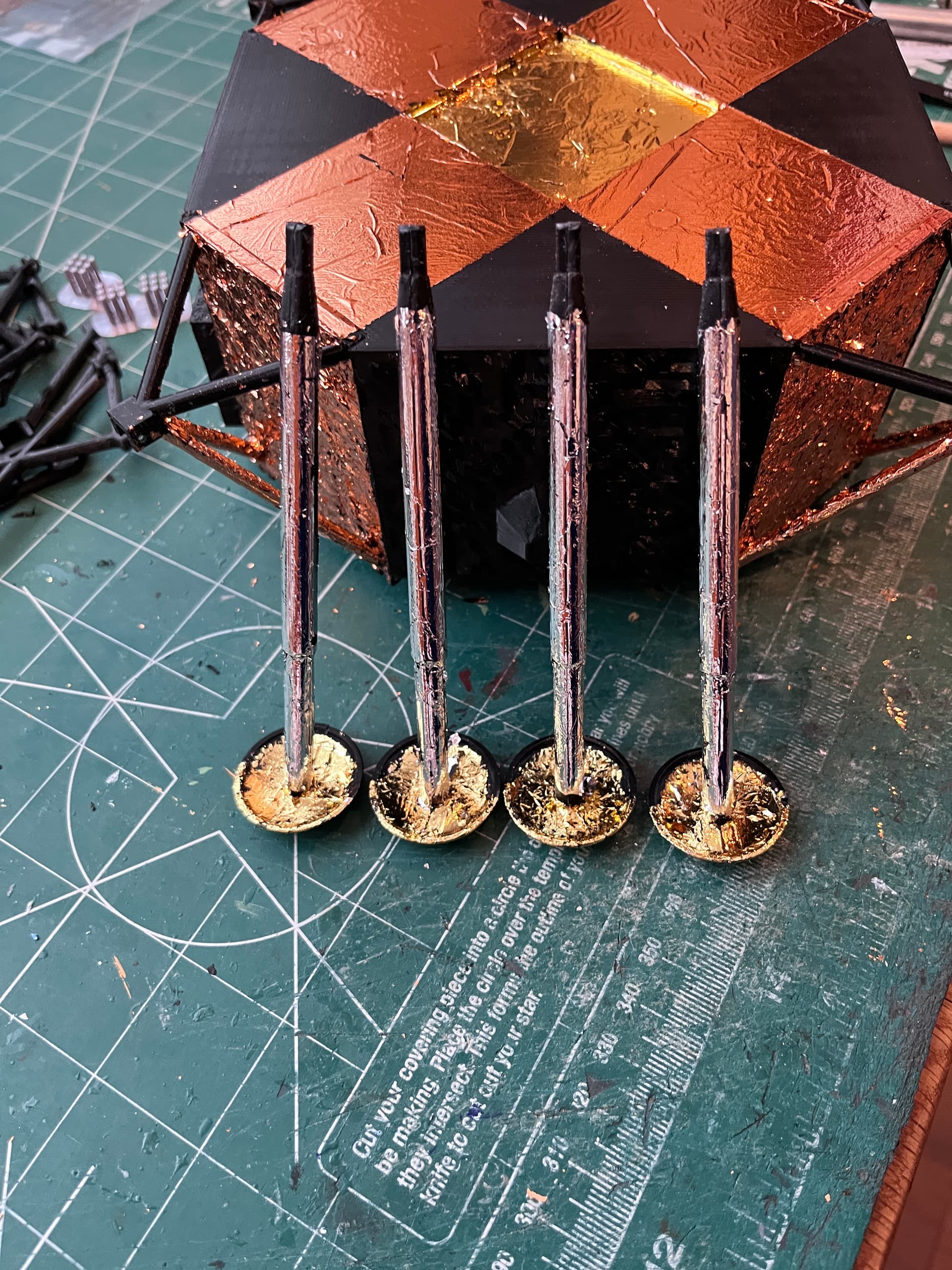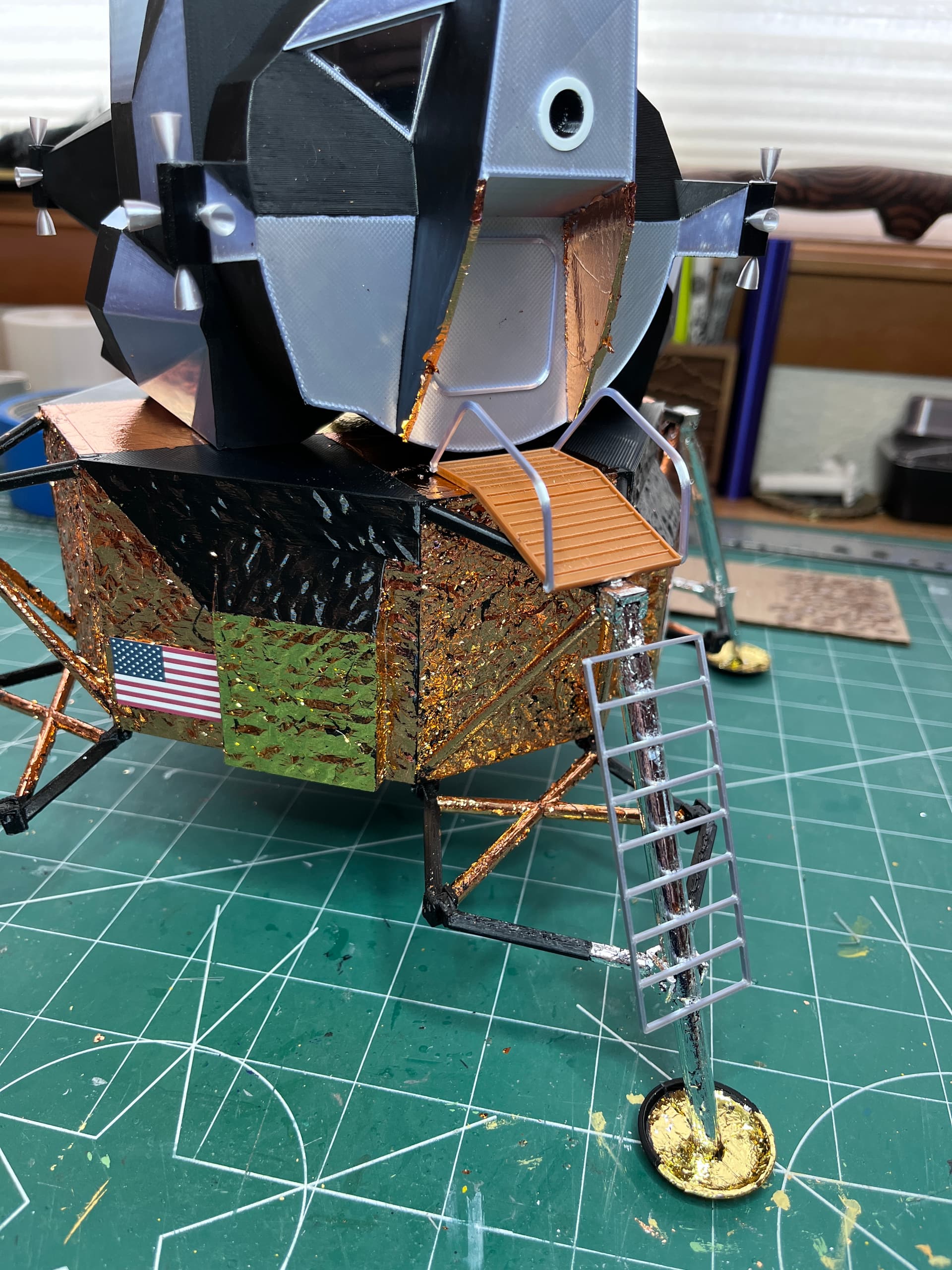 And as I descend into foiling madness… flakes of foil get everywhere. Two of the big sections of the ascent stage have been printed. I chose to print them in silver and paint the black panels a flat black.