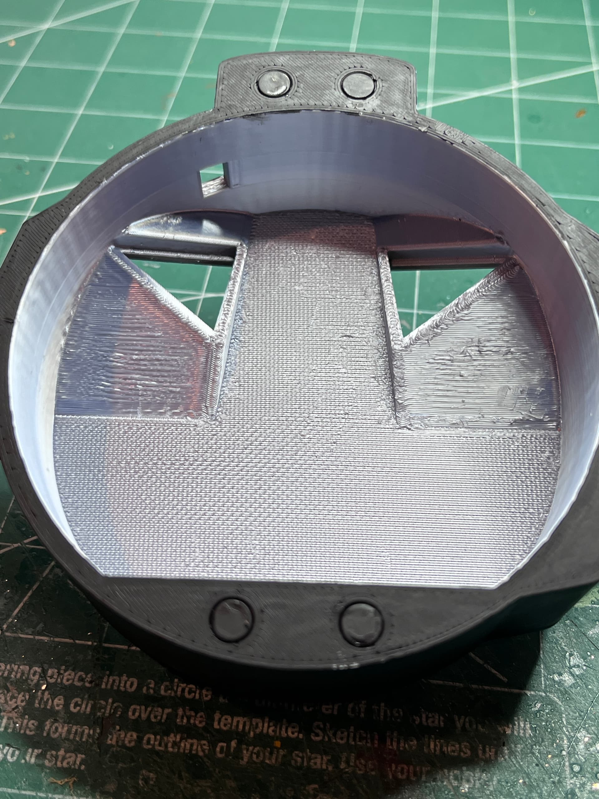 The tricky part of 3D printing is how to get the best looking parts which sometimes involves slicing and gluing. The sides that do not print well are the sides that are supported by supports. For the ascent front end I chose to print it as a complete part with supports holding up the inside. Here is the inside, not very smooth.