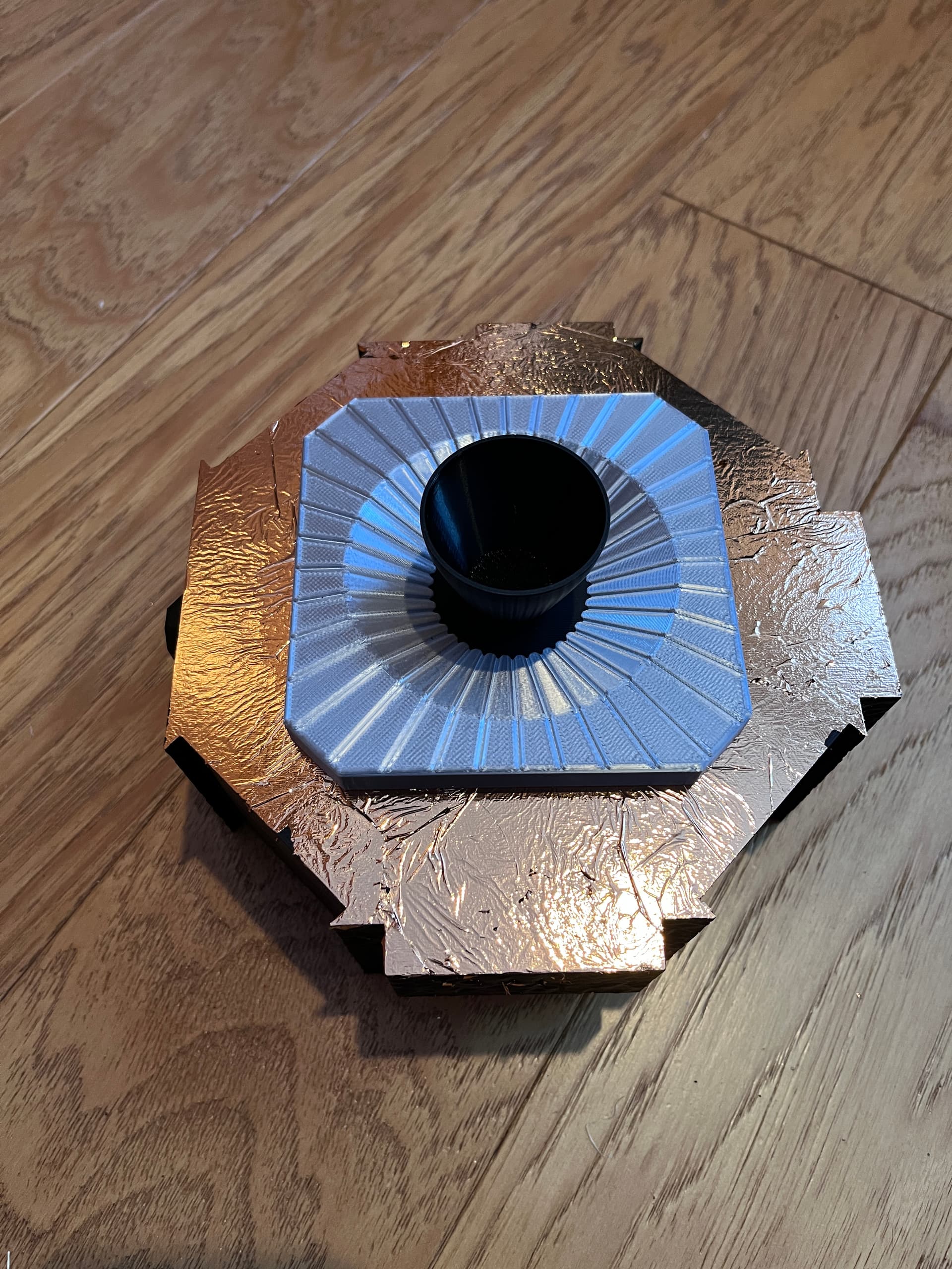 Continuing to foil. It is going to take weeks. The bottom was foiled yesterday with a rose gold. The glue is still not dry. Ask me how I know… Fortunately when foil is accidentally smudged off it is a simple matter of adding more foil. Drying will take about 4 or 5 days. Today I removed the tape and glued on the engine bottom plate. The bottom plate would be more accurate to foil with a silver foil but I chose to simply print it in silver. The engine nozzle is temporarily set in place for the picture.