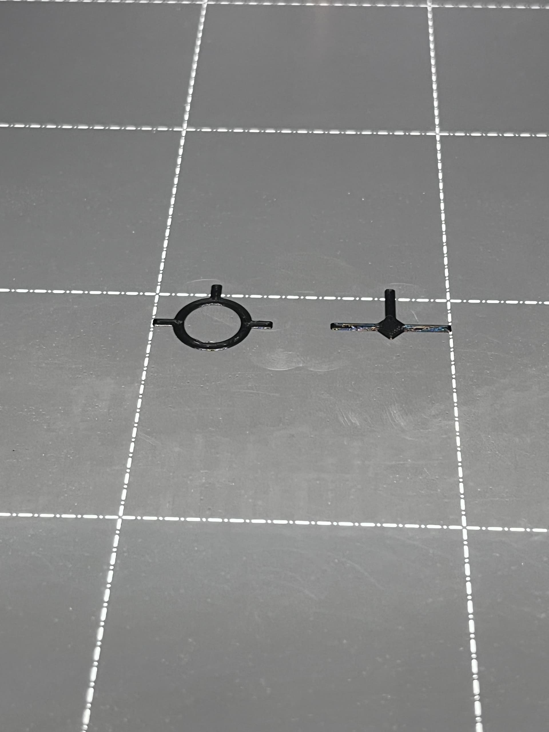 Remove any nozzle cleaning artifacts, change to a white filament, but DO NOT remove the black parts. Leave those in place. Now print the white parts over the black parts. You should end up with something like this.