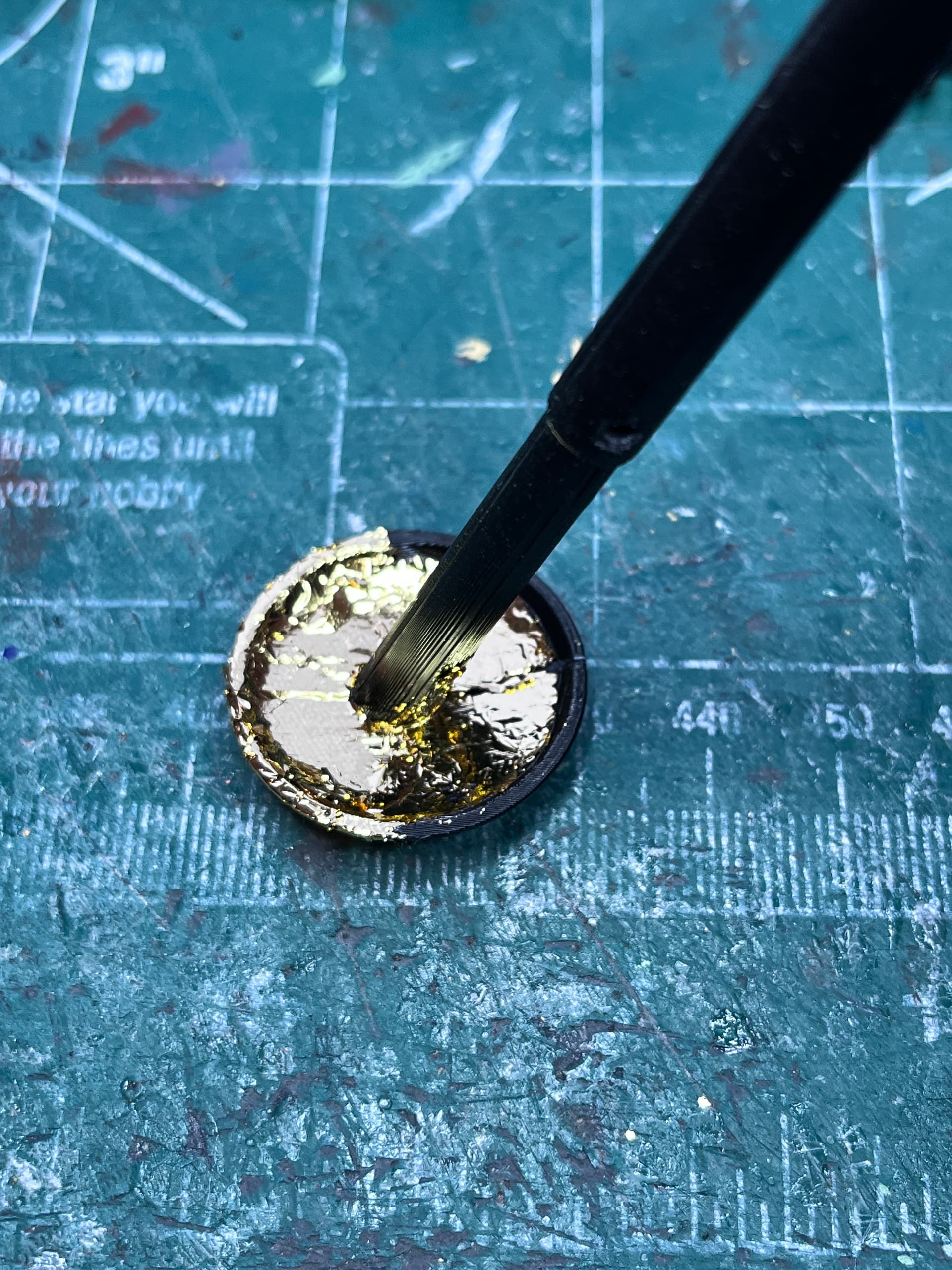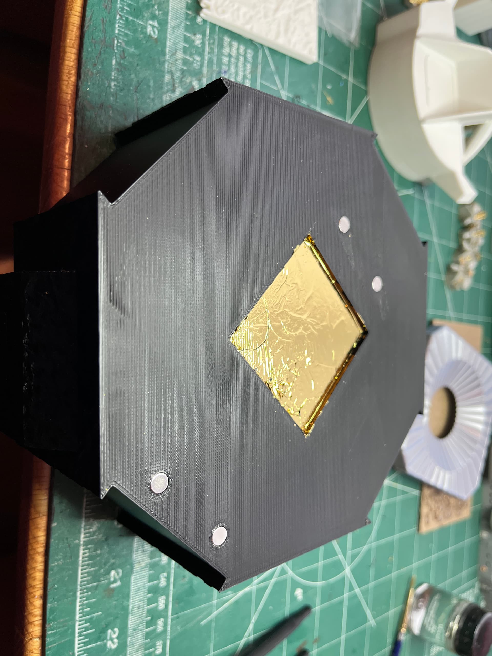 Most of the descent parts are printed in black. That way the three foil colors; gold, rose gold and silver can be applied and no painting is required. For the main body there are four 6x3mm magnets that are glued in. These will hold the ascent stage in place. I am adding them now so I can foil over them and they will disappear. You can also see that I have started the tedious foiling process.