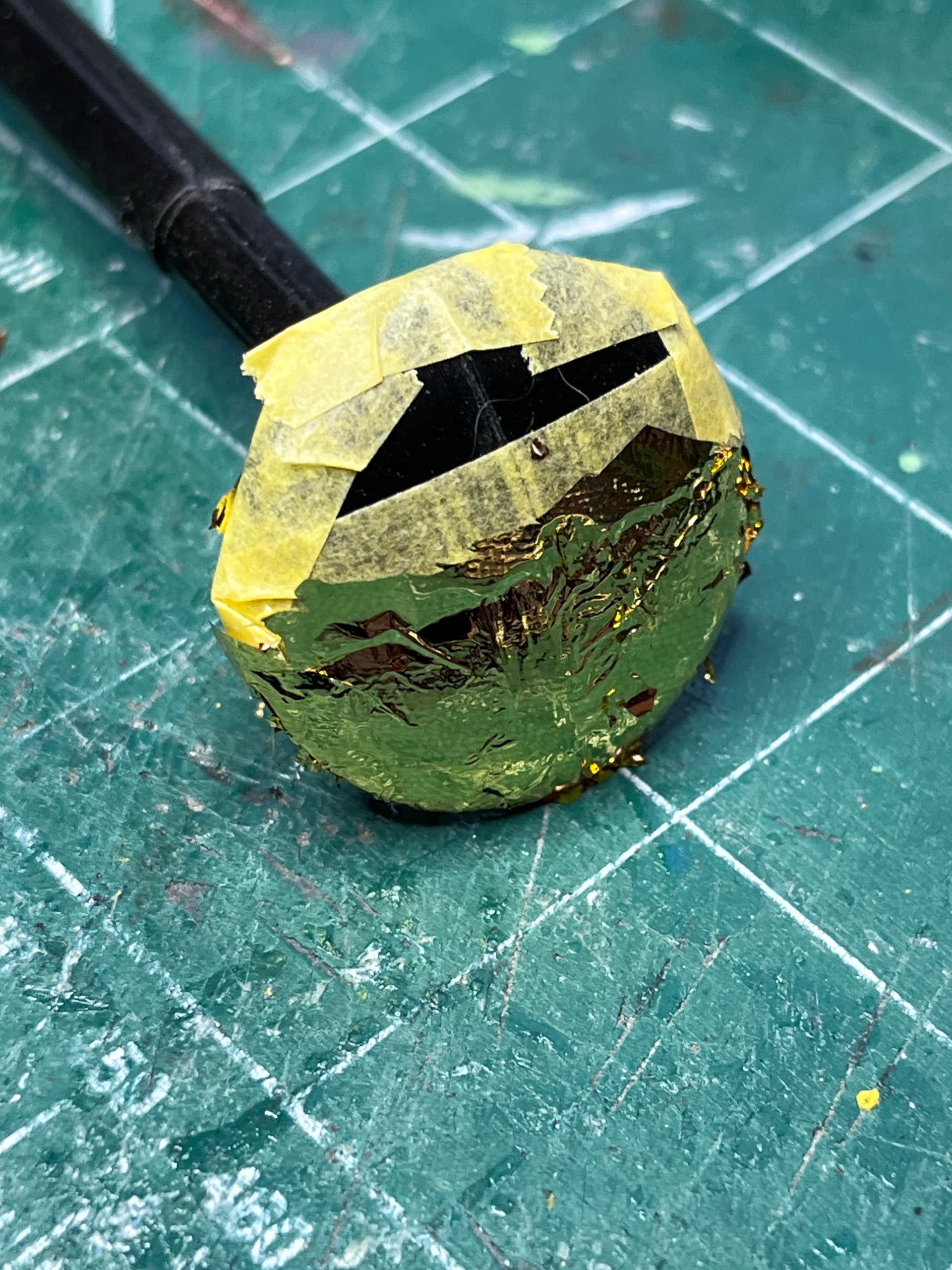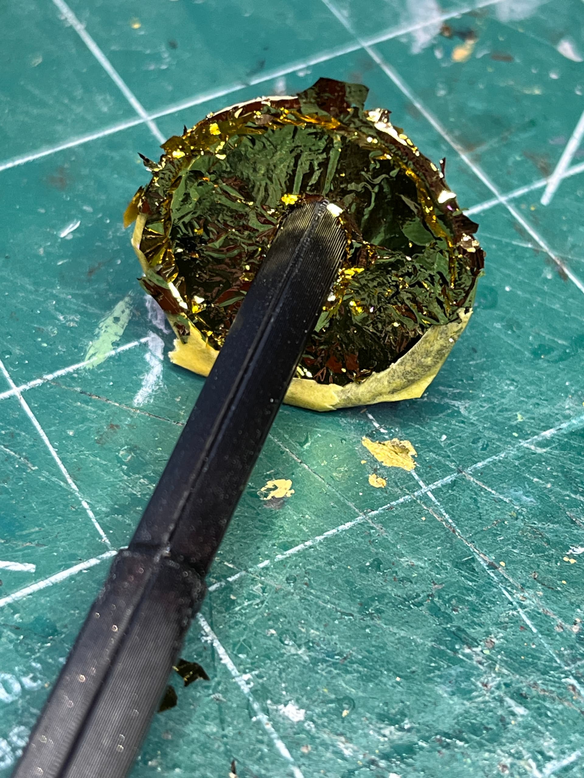The foiling process will be 1) tape off area, 2) brush on light layer of glue, 3) apply foil and tamp down with brush, 4) after a day or two remove tape and check if more foil needs to be added, 5) wait another 2 or 3 days before continuing. Here is the top and bottom of one of the legs. Half the bottom and the corresponding lip is black so after adding tape, the exposed portion was glued and foiled. There is still excess overlapping foil that will be lightly brushed off tomorrow before removing the tape.