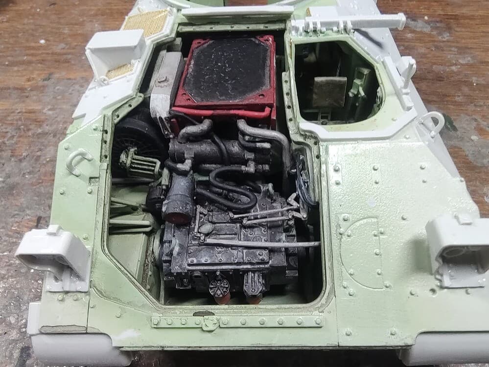 I have closed it up and completed most of the hull. I failed to take pics before closing it up though. Here is the engine and transmission area after weathering and installing them in the hull.