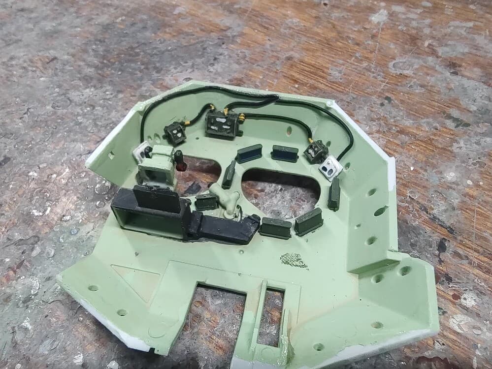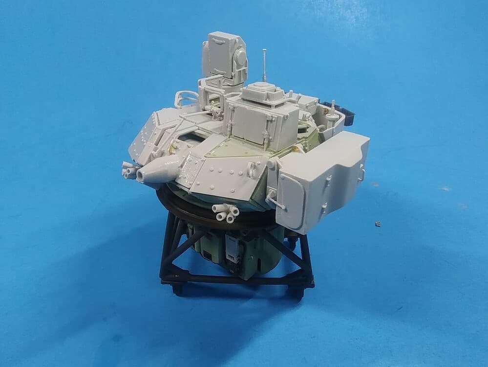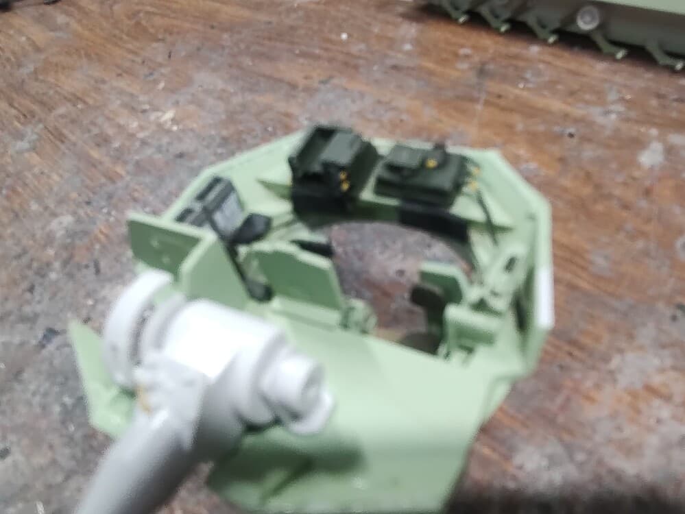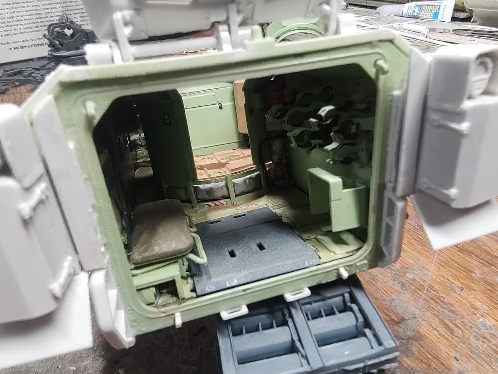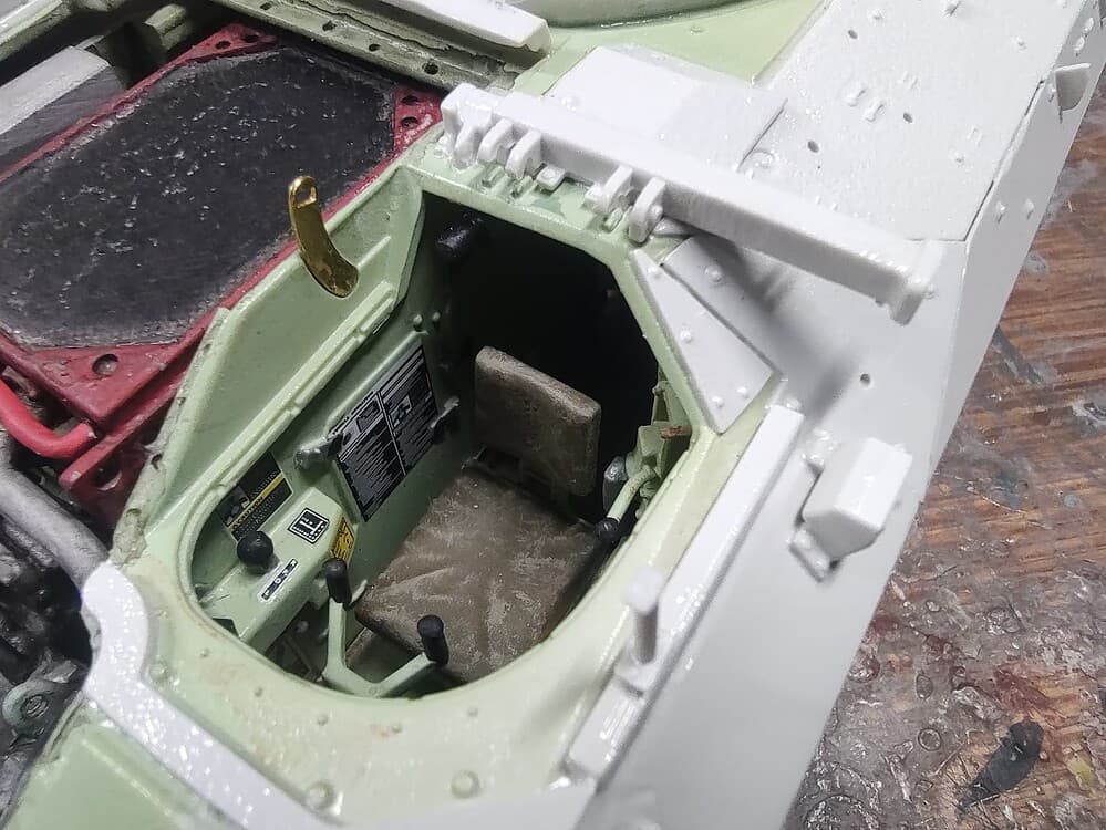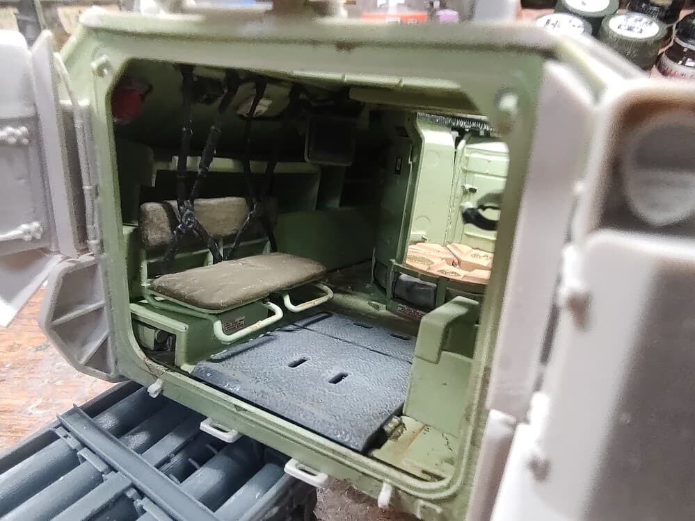 I have weathered and detailed the turret interior. I added SINCGARS ASIP radios, an intercom system, interior lights, etc., etc., etc… Most won’t be seen, but I know it is all there.