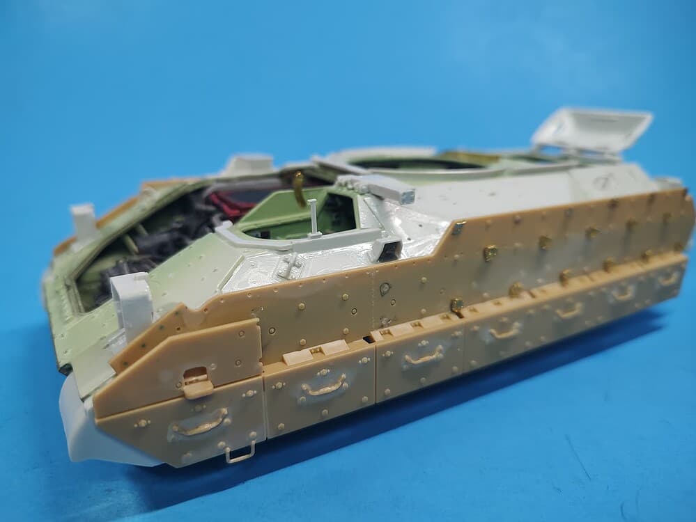I have completed the build of the Bradley so far. I didn’t want to use the ERA on it, so I swapped out the Meng side skirts that have the mounting bars molded onto them with flat ones from an Academy kit. I also added the tie-down blocks from a Model Factory M2A2 ODS-SA kit that I will use the ERA on. The PE tie-down blocks are nice as they are made without connection points, so no sanding, but you still have to fold each piece. Each block is made up of two flat pieces with opposing ends folded, stacked on top of each other. They were still a pain to do.