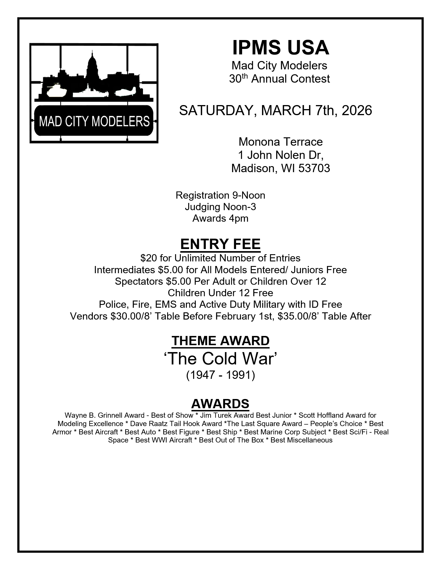 Roughly 3 months to go till the Mad City Modelers contest in Madison, WI on March 7, 2026 in downtown Madison at the Monona Terrace Convention Center.