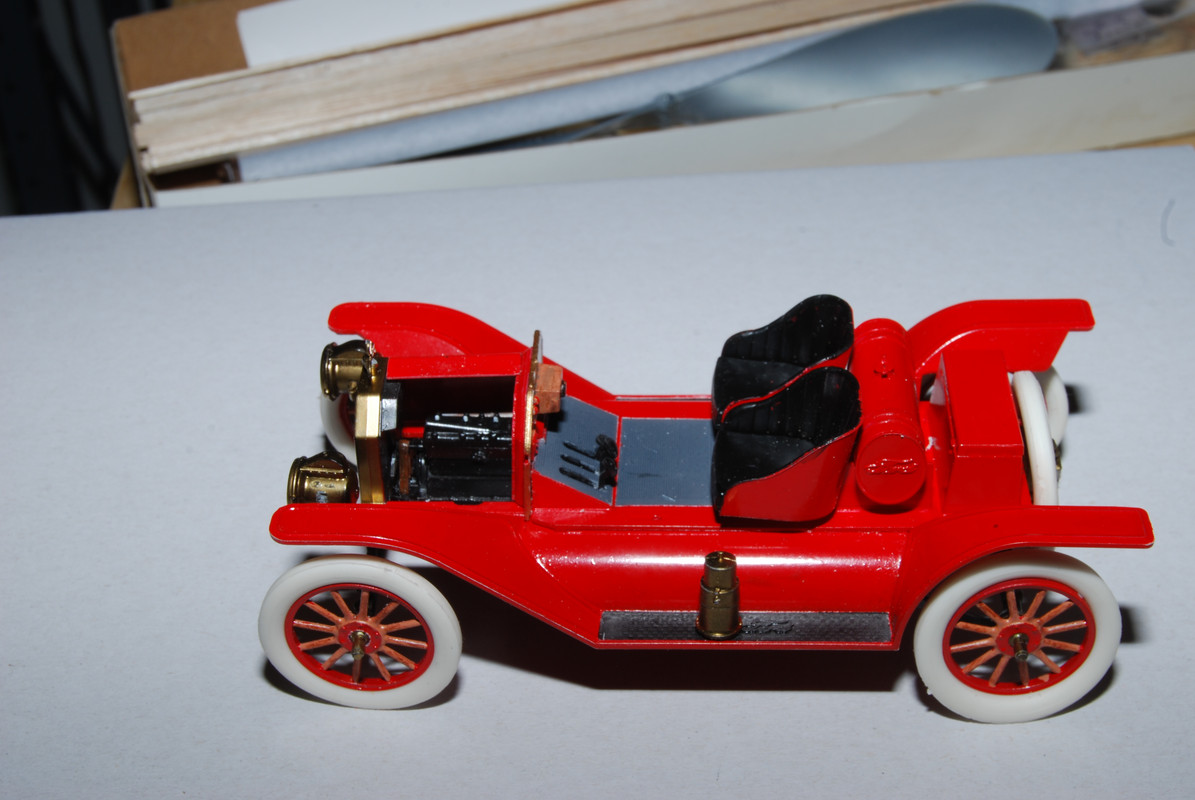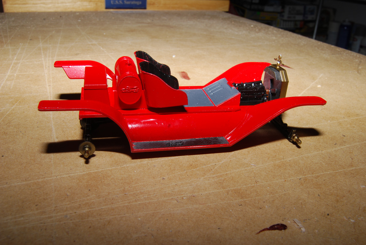 The lower body is still in (Tamiya) prime. The body will be all red. I was a little surprised that the brass stuff- the radiator and lights, were not vacuum plated. But I am comfortable with Alclad, so I have used Brass alclad and have almost all the brasswork painted already.