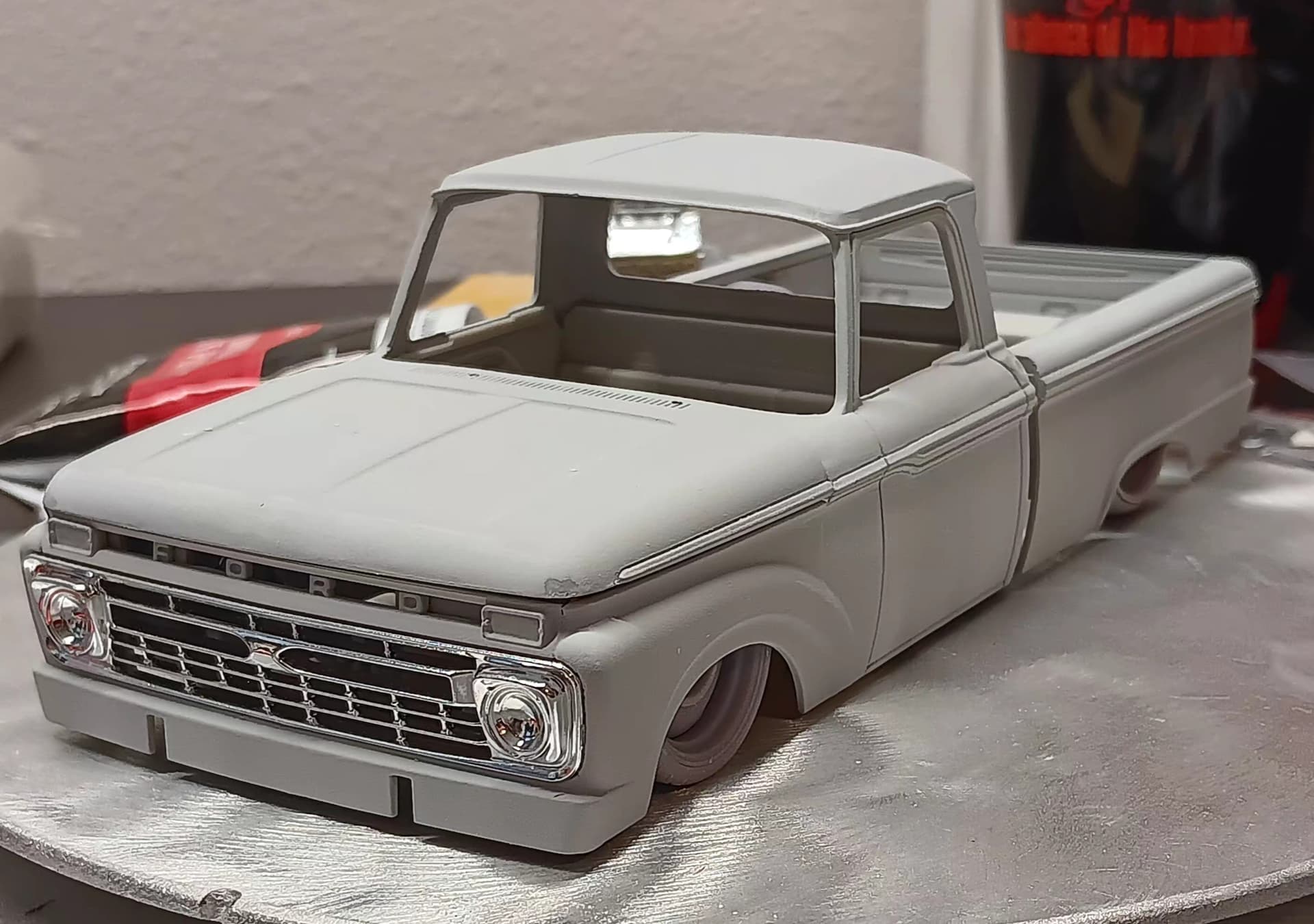 This is my Moebius/ Model King 66 F100 shortbed " Hard Parked" edition. The only oob parts used are the body and interior pieces. She’s been smoothed, shaved, and filled everywhere. I have 3d printed and or purchased 3d printed parts to fully detail my frame dragging addiction.