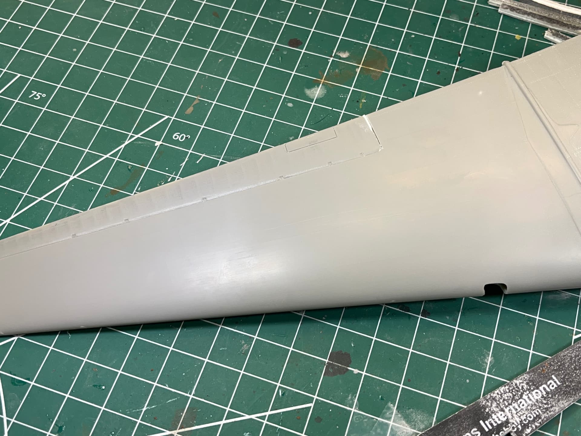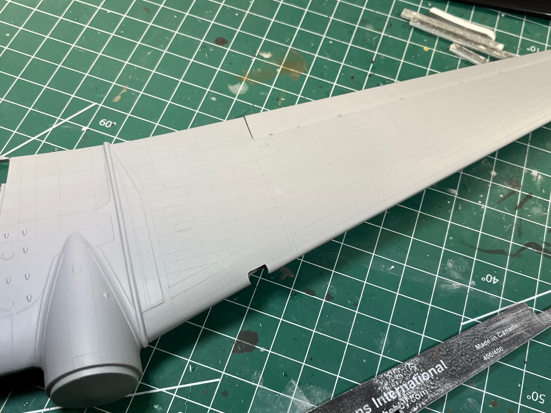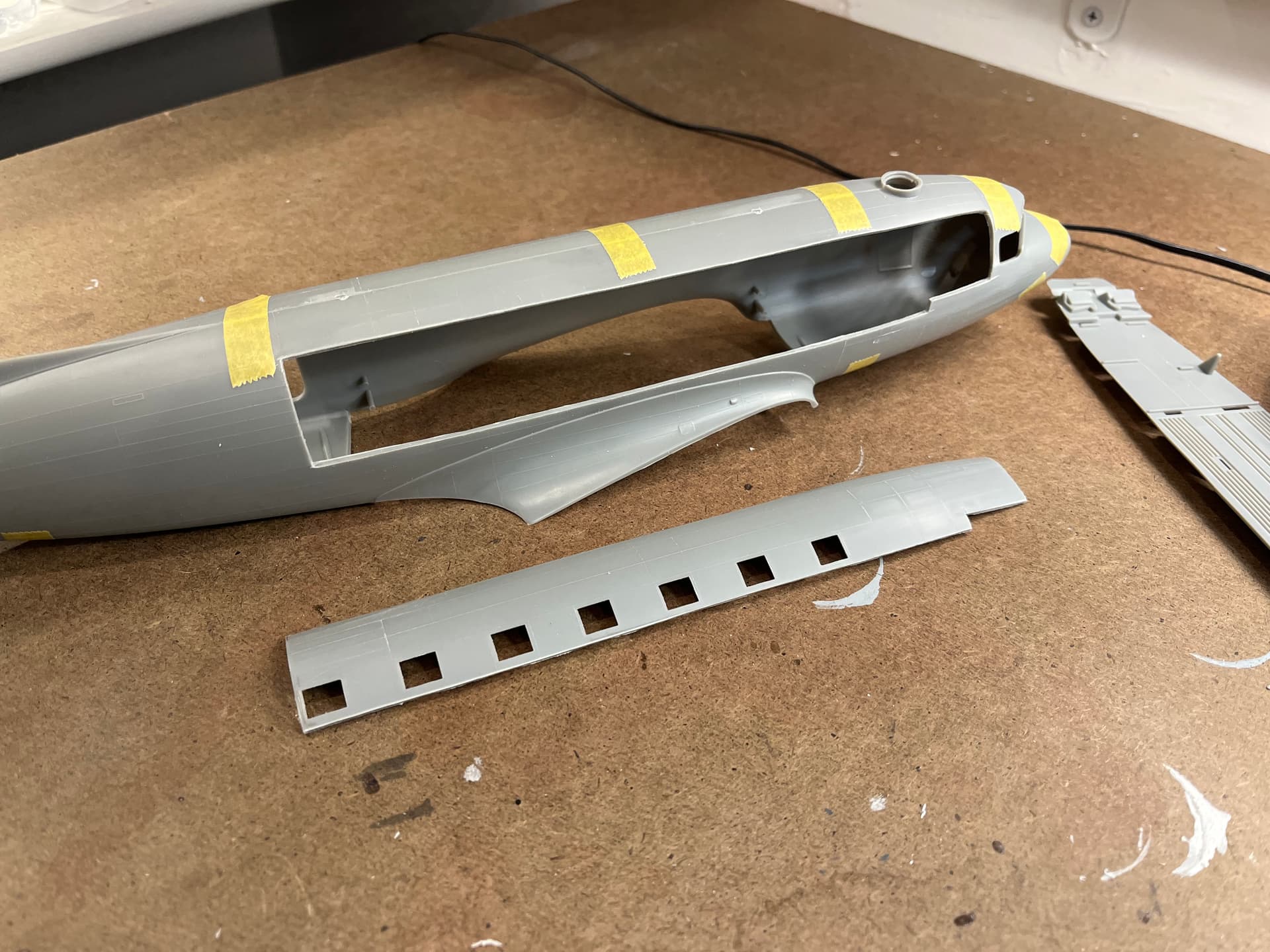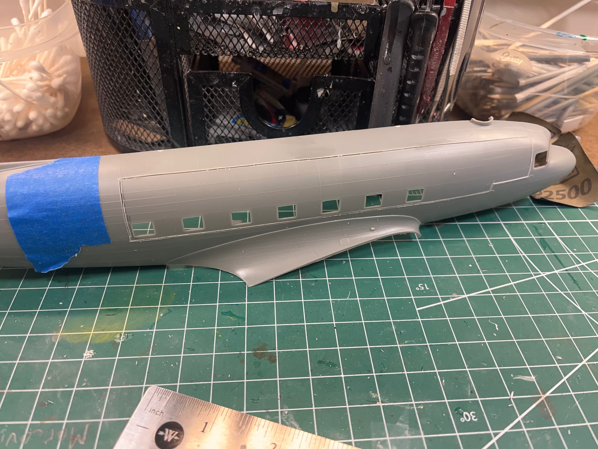 I wanted to build something special for him. I asked him if I could cut two holes in the fuselage to expose the interior. The first thing I did was sand off all the raised detail on the exterior. After everything was sanded smooth, I went to town with a rivet wheel.