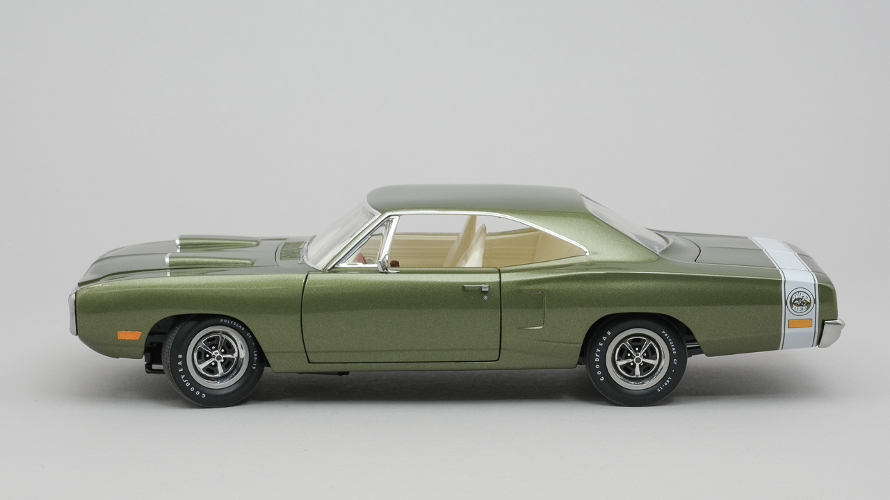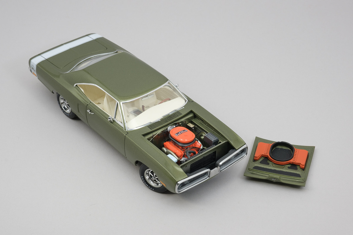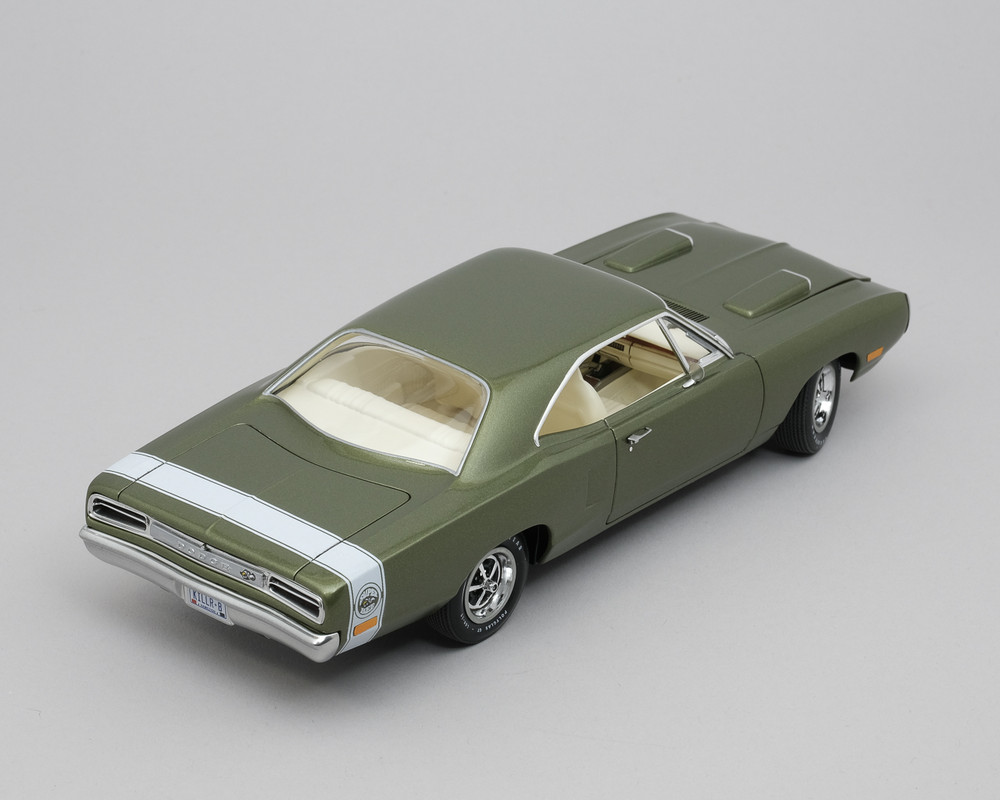 This is my MPC 1970 Dodge Coronet Super Bee. This has been in work for quite a few years and I am glad to have it done finally! Added plug wires, door handles and seat belts. Replaced side marker lights with aluminum tape. Painted with MCW Limelight Metallic Green.