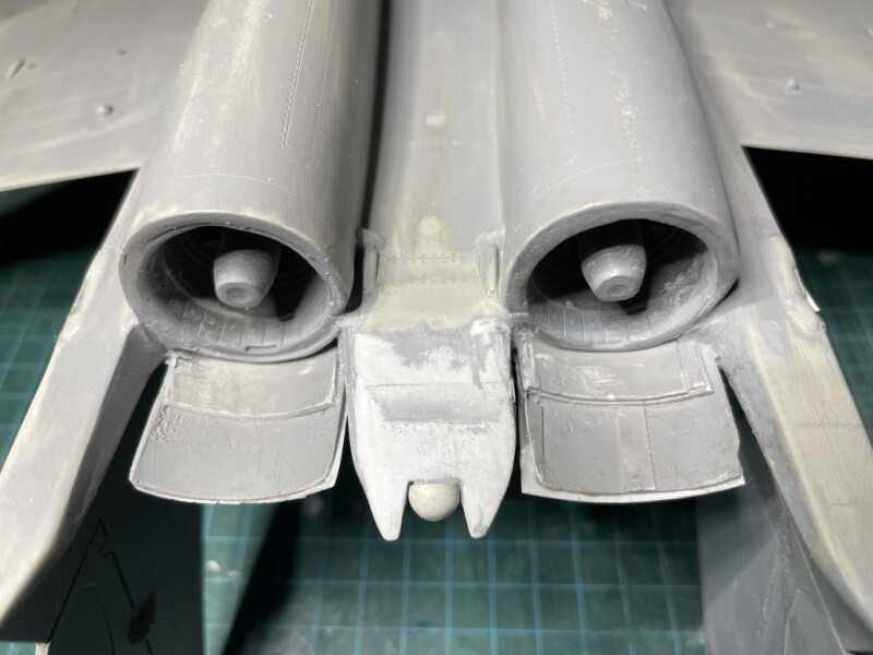 I made new exhaust nozzle fairings as the original kit design would not work with the new RESKIT nozzles. They cover various components, including hydraulic actuators for nozzle control and providing aerodynamic shaping for the nacelle.