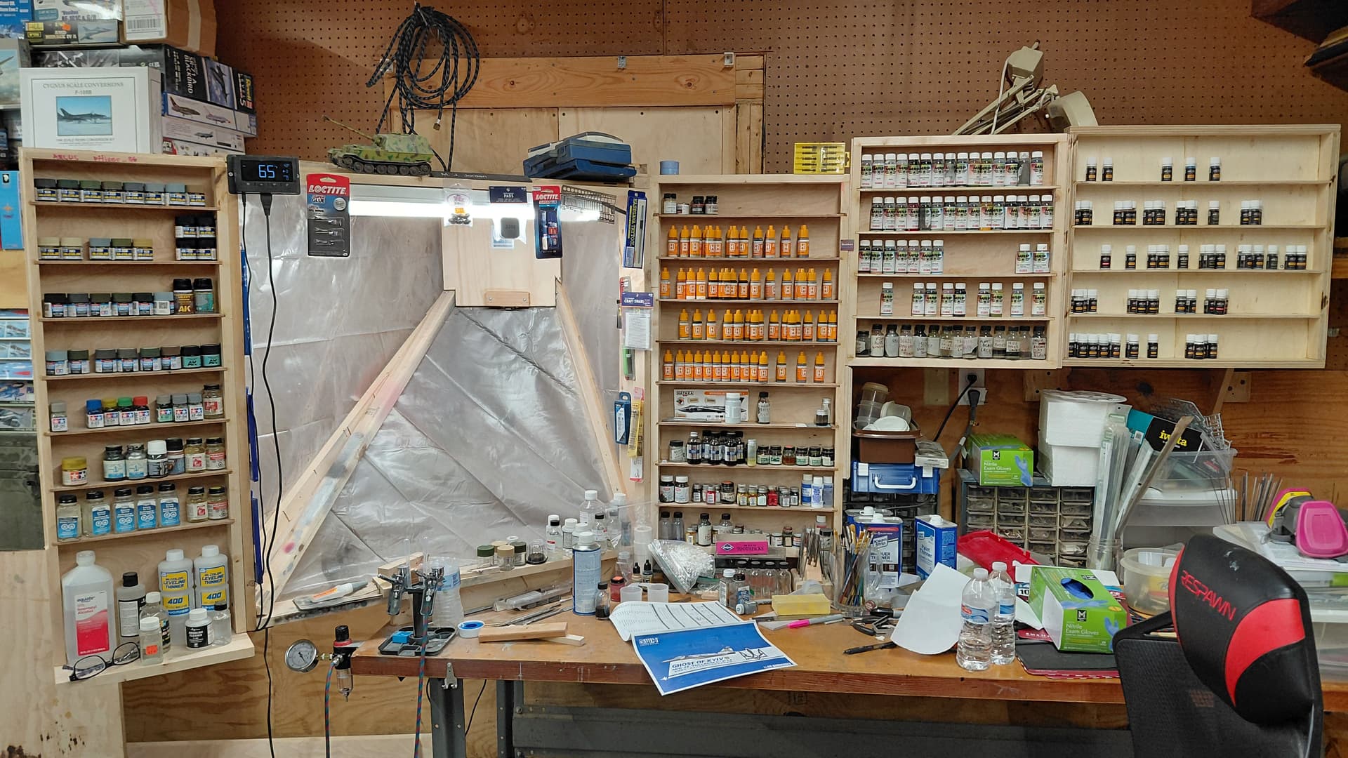 The tabletop I bought used and sealed it with polyurethane and the table legs came from my father. The paint racks are secured to the vent frame and back wall so they are pretty solid, I actually made them all with scrap wood and there are a few different sizes.