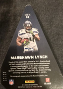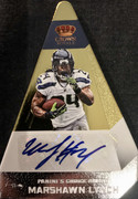 The first card is a 2012 Panini Crown Royale Choice Award Die Cut Auto Card 10/15 of Marshawn Lynch a RB position player for the Seattle Seahawks. He was famously known for his eating of Skittles.
