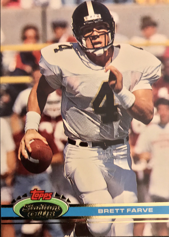 This next card is whats called a SP or short print as not many of this set was printed which made this rookie card a much harder find at a decent price point. So I did the next best thing of which was to purchase the 1992 Stadium Club complete set for a whopping $10.00. I found out that most collectors are chasing just the rookie card and does not want to own 499 cards plus the storage concerns. My idea is payless and sell more. Just a quick note, this card is not an official rookie card as Brett Favre was drafted in 1991 by the Atlanta Falcons. In 1992 he was traded to the Green Bay Packers. So collectors like myself make this a unofficial rookie card as he has a Green Bay Packers uniform on.