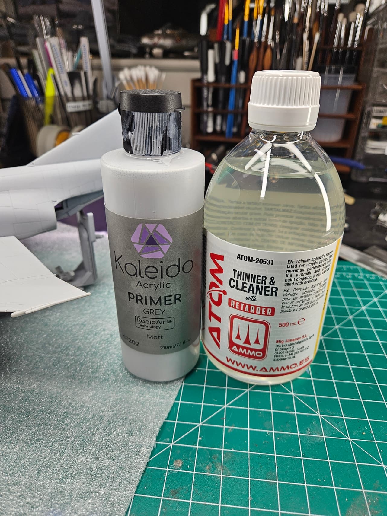 I tried different ratios and settled on about 30/70 for primer though he says use 2 drops paint and 10 drops thinner, which seems really thin to me. That was for a game air paint, so you will want to test for yourselves. I’ll probably try his ratio when painting with colors rather than primer, though Atom says 30% thinner is good.