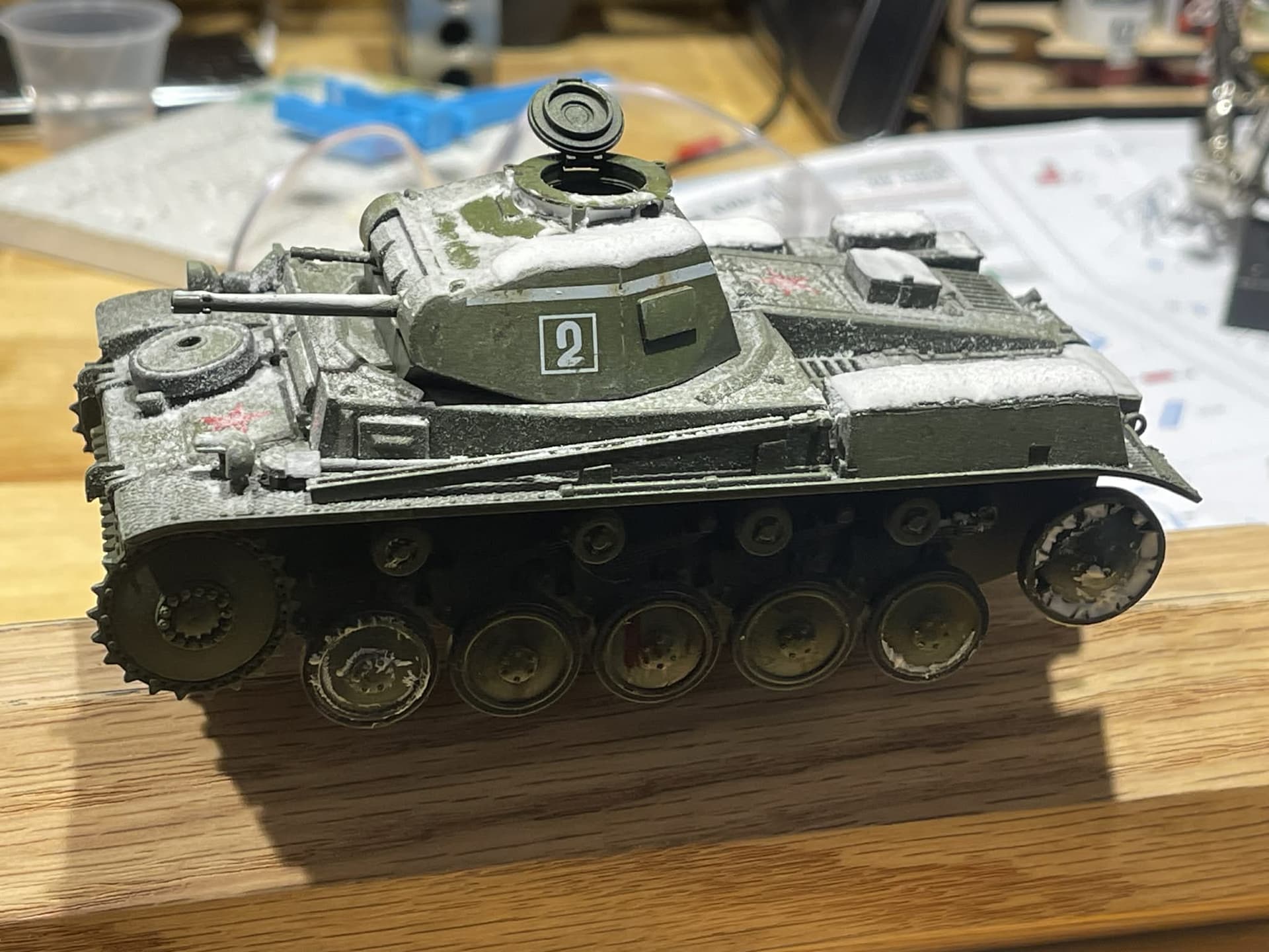 Mine’s suffering all kinds of weathering experimentation indignities. Had these extra Soviet decals I stuck on there too, so I guess it’s an imaginary captured Pz. II? My reading suggests that by the time the Soviets were in a position to capture any of these, they were obsolete enough to be undesirable for front-line use.