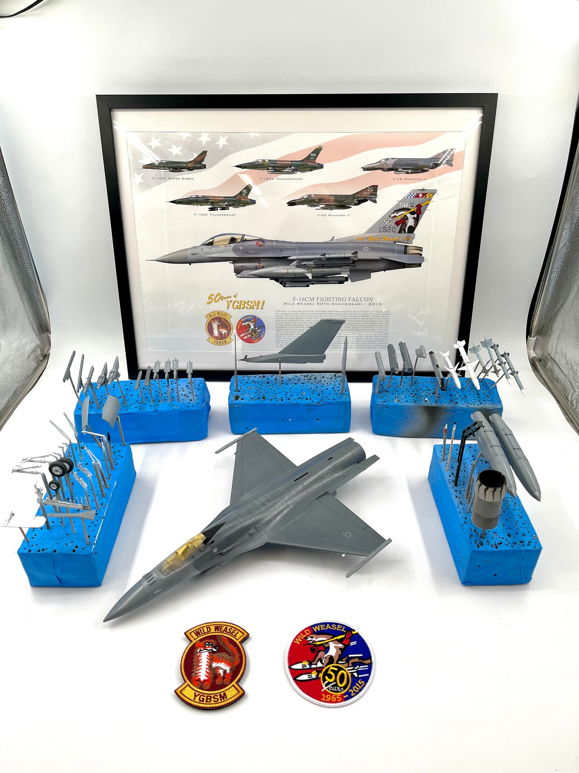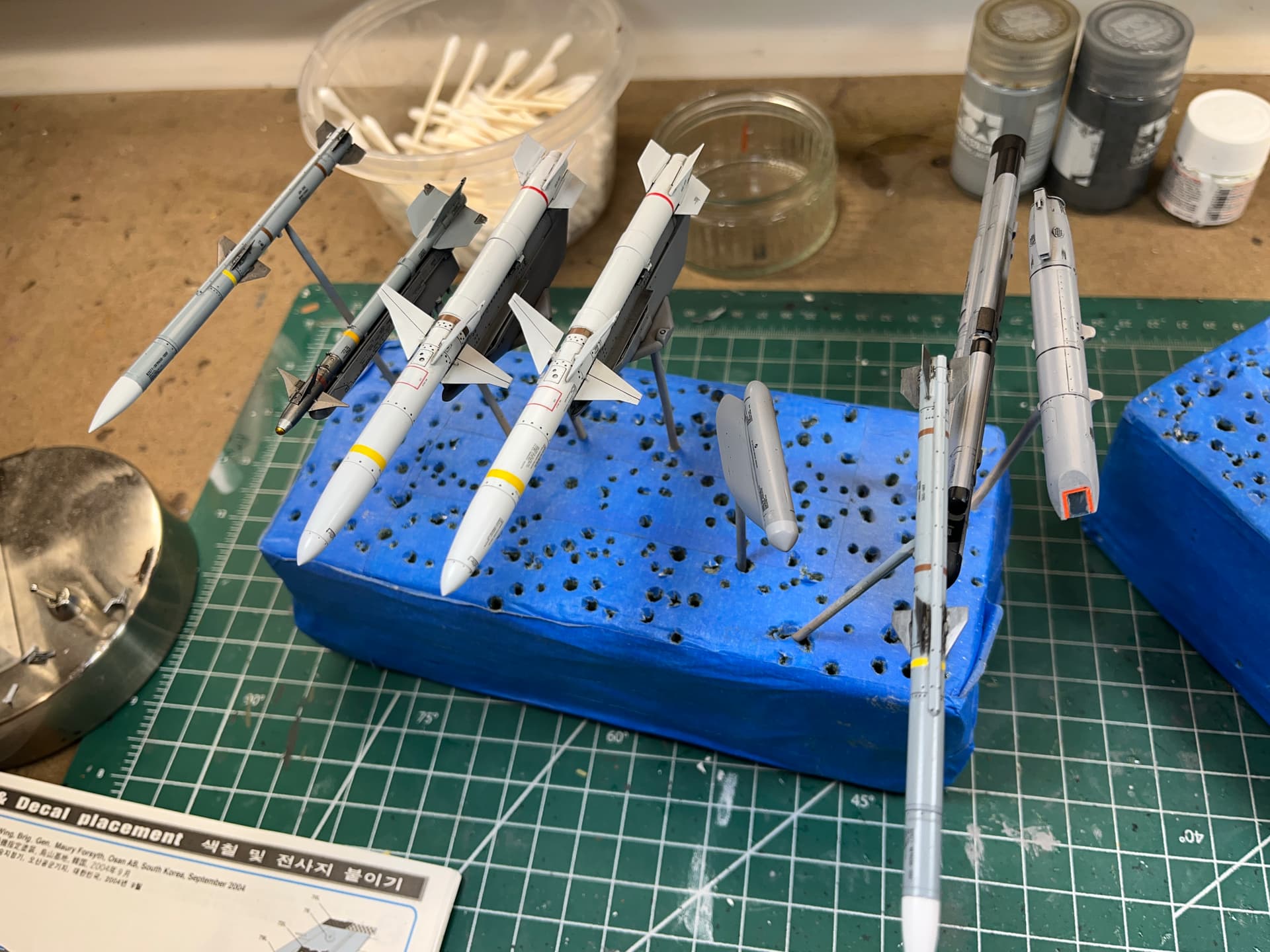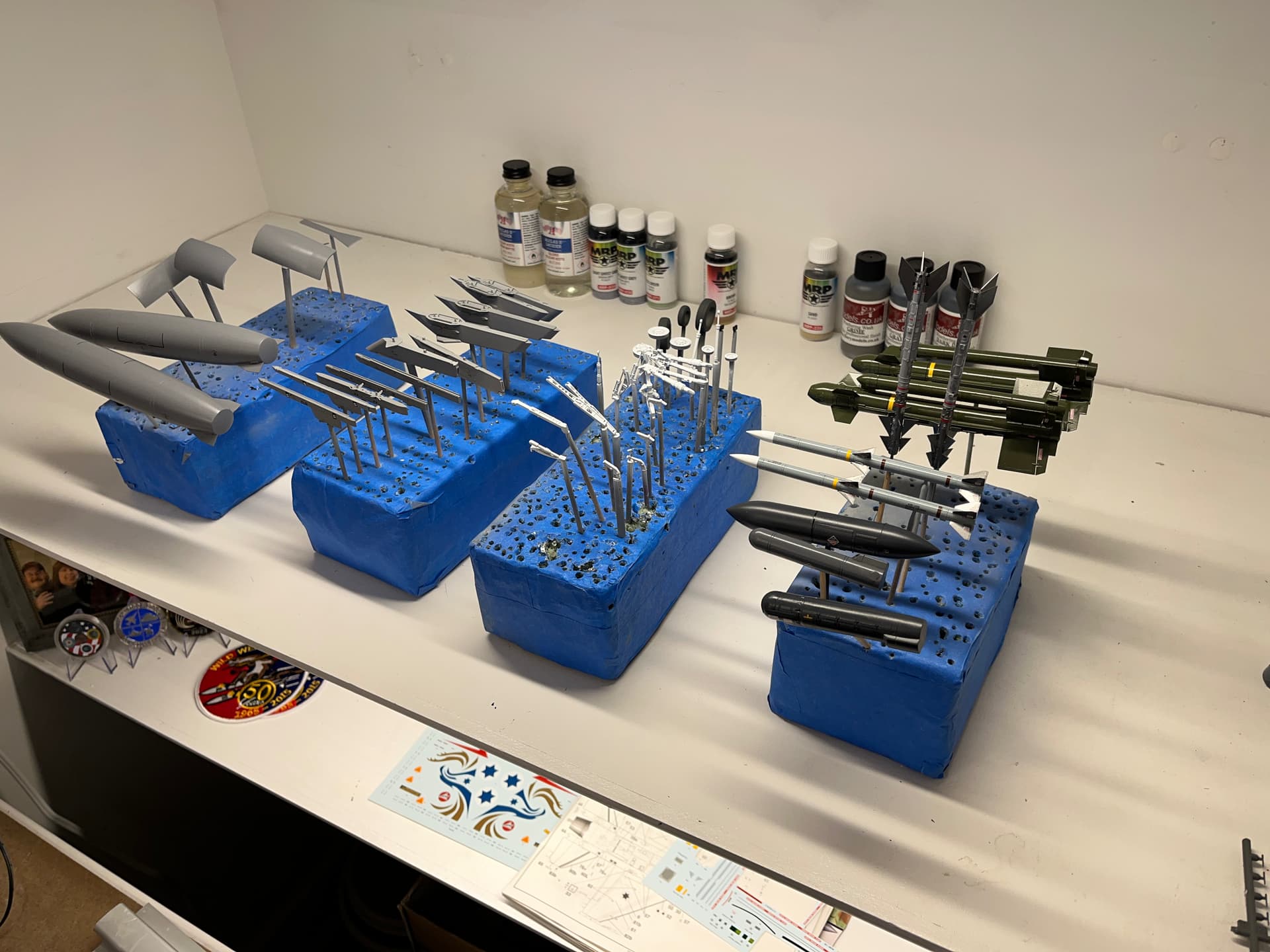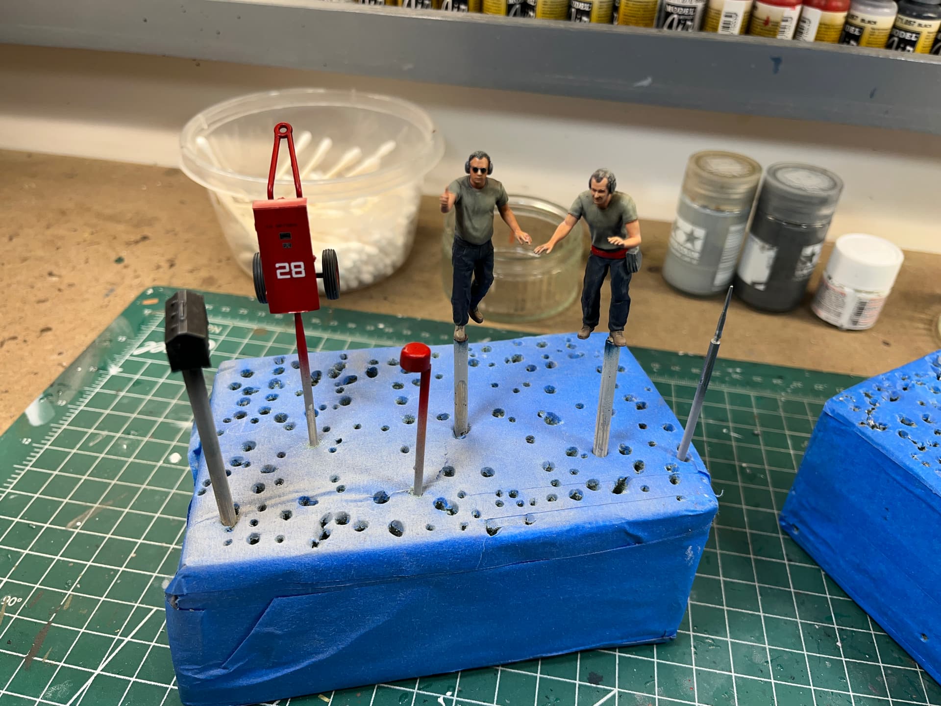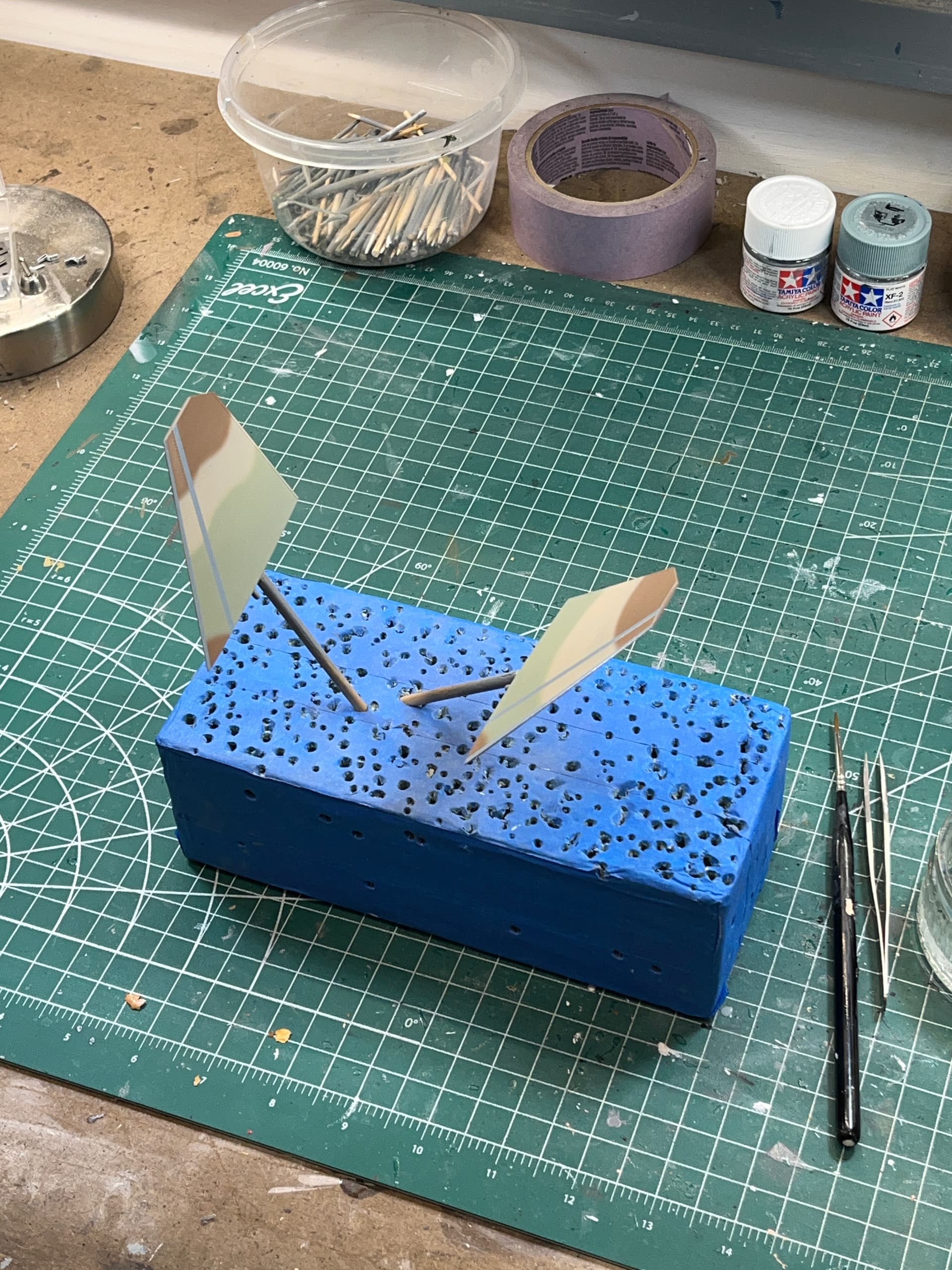 I’ve been doing this for years. All sub assemblies are on one block. For instance, the landing gear for an F-16.No need to handle individual parts. Paint, decal, and weathering. Once it’s done, pop it off the end of the toothpick and assemble. Floral foam blocks.