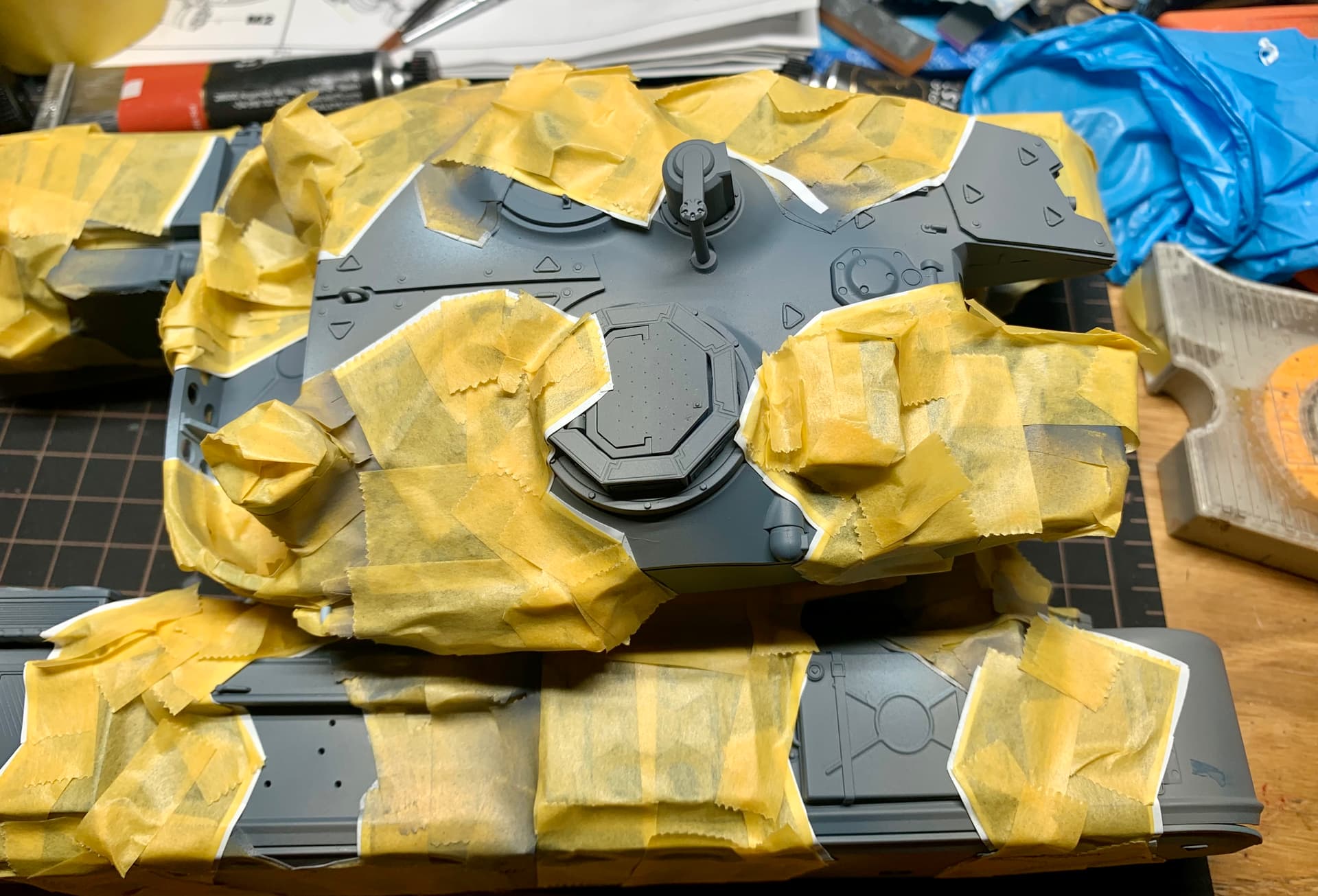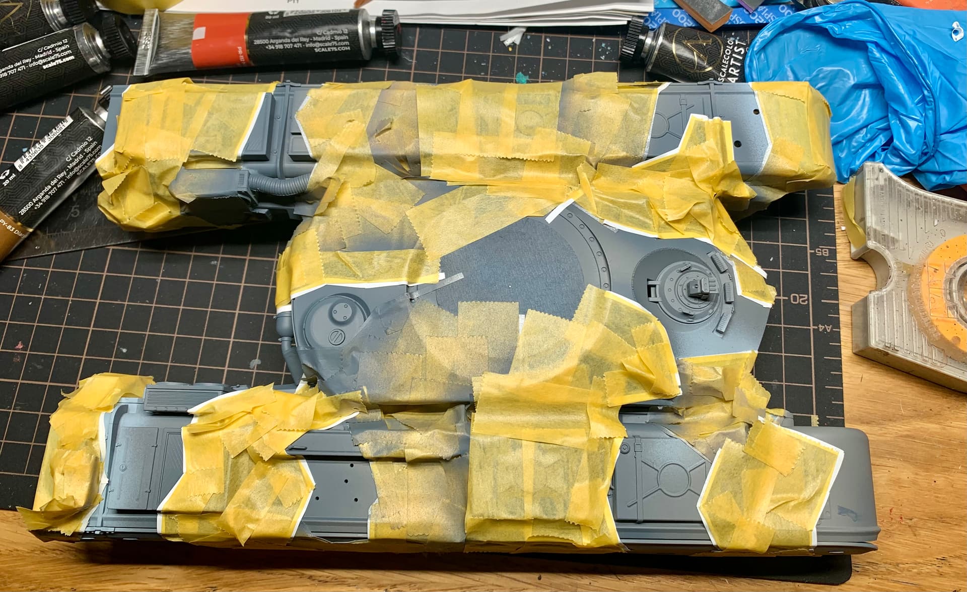 As you can see it requires quite a bit of masking but the hard edges were mostly mapped out with the white tape before using regular masking tape for the in between areas. Ensuring the white tape was snugged down over the details prior to airbrushing was probably the most important thing.