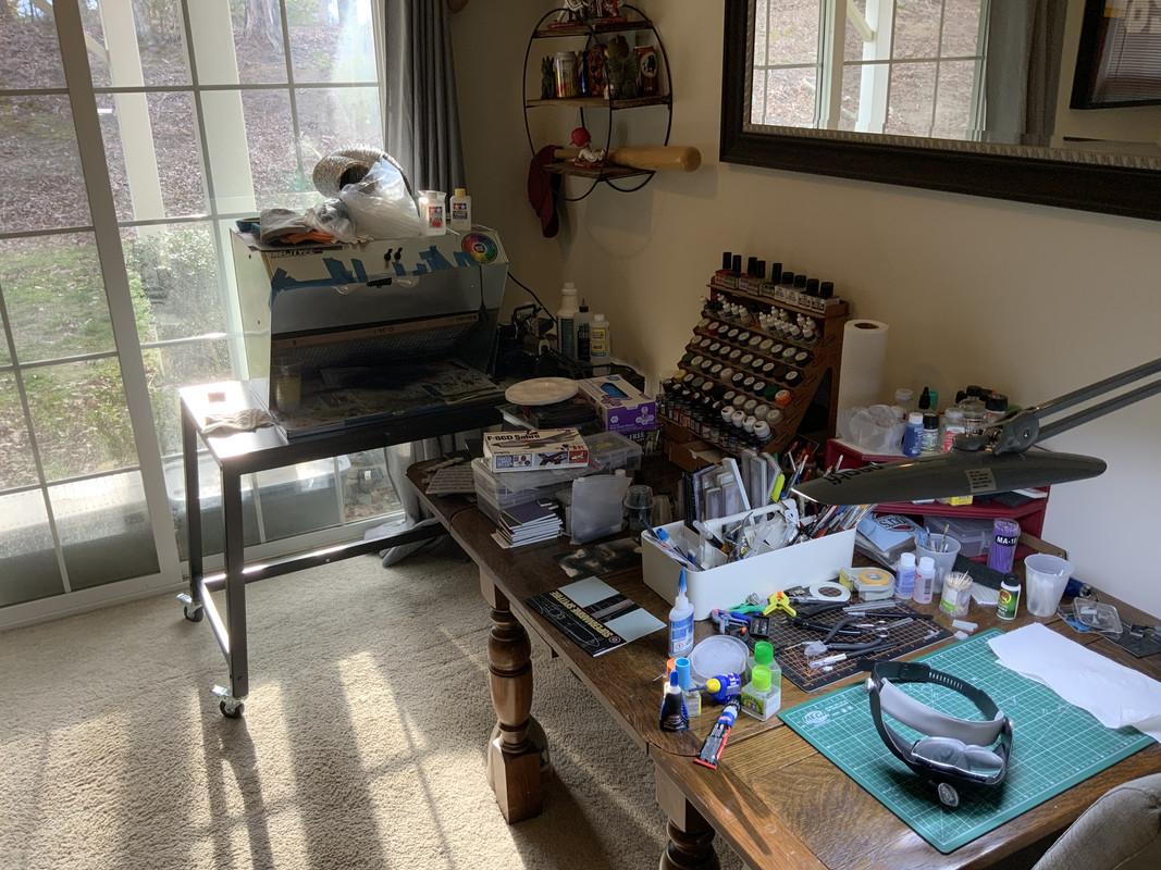 Not very fancy. Some very impressive rooms posted. I just roll that cart to the sliding door and run the hose out for airbrushing.