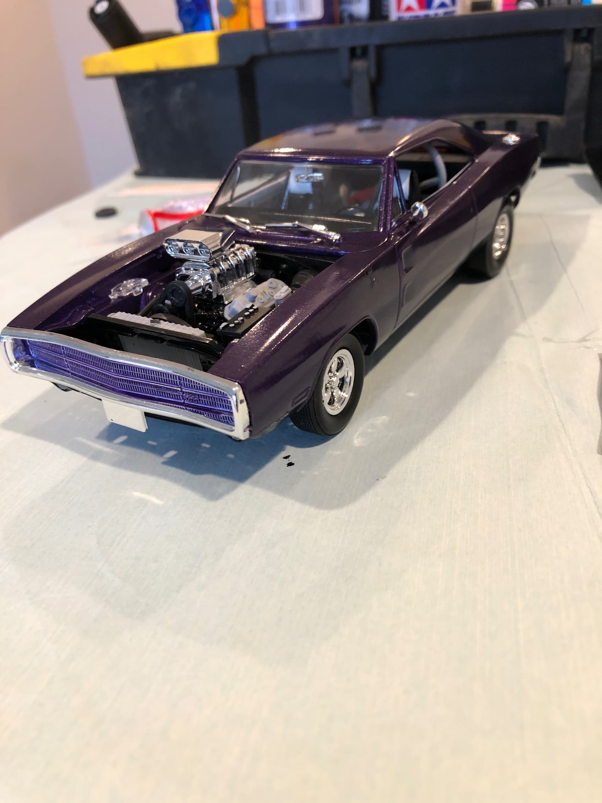 Not my first ever because we didn’t have a camera back then and I was never interested enough as a kid to take a picture of my model, but, here is the earliest picture I have (2020) which was my unofficial comeback to the hobby since being a kid. Not bad for tube glue, a testors 5 or ten piece paint set and a can of spray paint, oh and those horrible testors paint brushes, and the kitchen table.