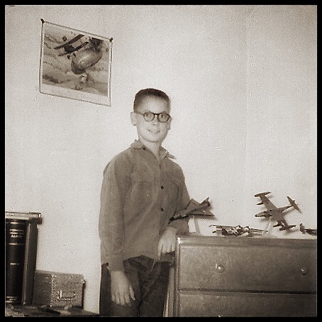 My teenage model building ended when I got interested in photography. Sadly, I never even thought to photograph the models I had made (at least a dozen various aircraft, ships, boats, cars, and trucks), but I do have this photo of me in my bedroom with a few models in the background and a stamp albums on my desk. The photo was probably taken circa 1959.