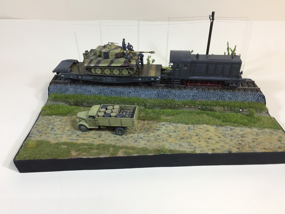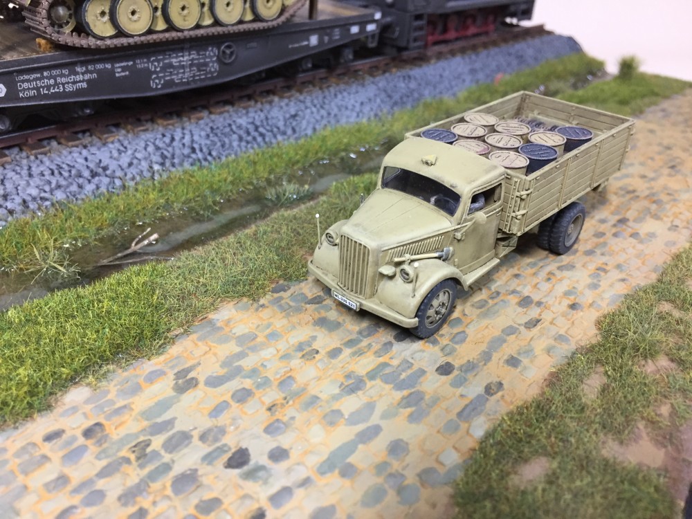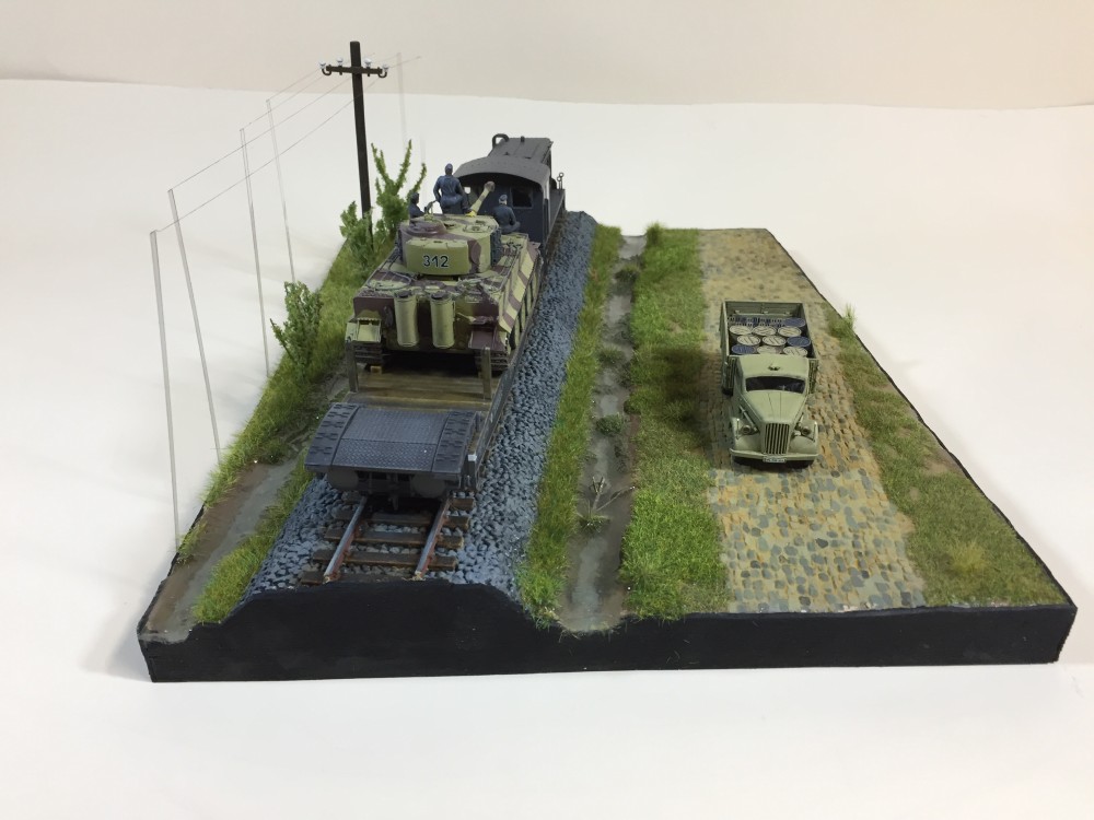 Just finished this little diorama. It is the HobbyBoss 1/72 WR360 C12 locomotive and SSyms80 flatbed, which kit also included the Tiger tank. Additional an Academy Opel Blitz cargo truck is playing its role. Figures, telegraph pole and fuel drums/jerrycans are 3D printed.