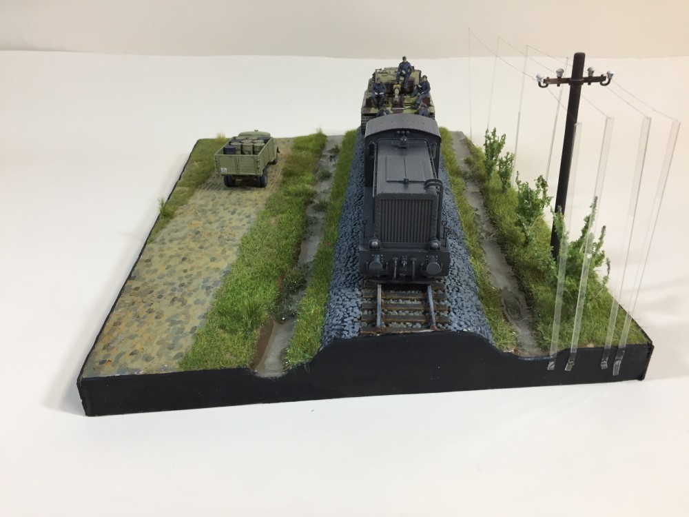 There is a lot to enjoy in your diorama. The ditch with the water and the partially submerged debris shows a great eye for detail. The is a controlled amount of weathering and grime. Your solution for stringing the wires is certainly a novel approach. Iām wondering though, could you have put two poles at the extreme edges of either side of the base and strung between them, or does this not work because of the scale? (Poles to close together.) This is definitely a diorama to be proud of!