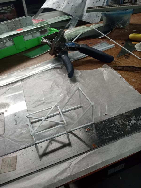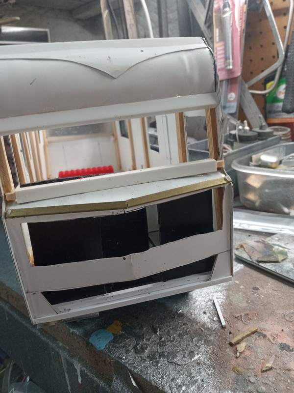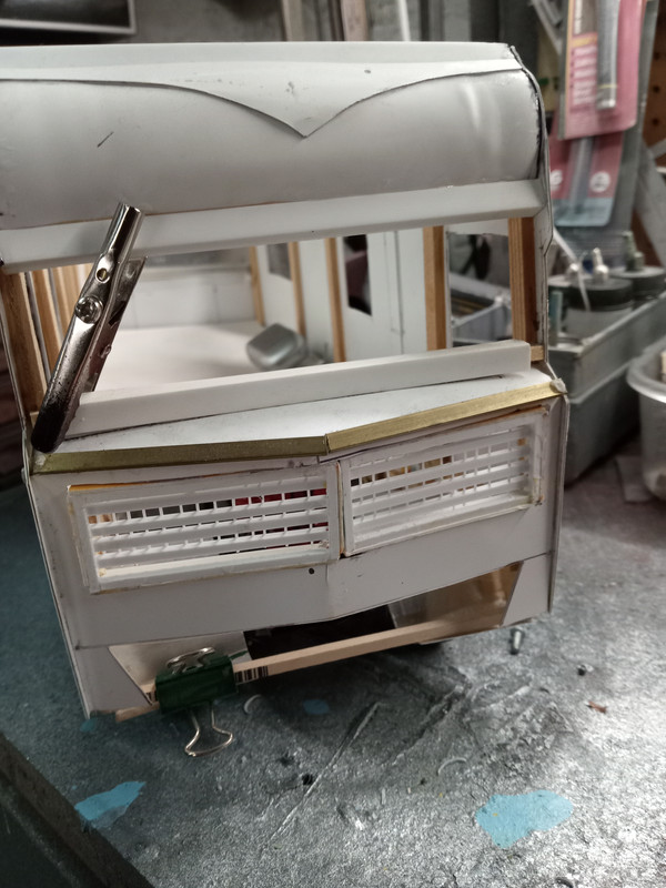 After a few years ,I have decided to resume work on this Winnebago project Constructed of sheet Styrene and wooden strips the chassis is an AMT Kenworth chassis .Today I scratch -built the upper grille sections made from evergreen Styrene strips …