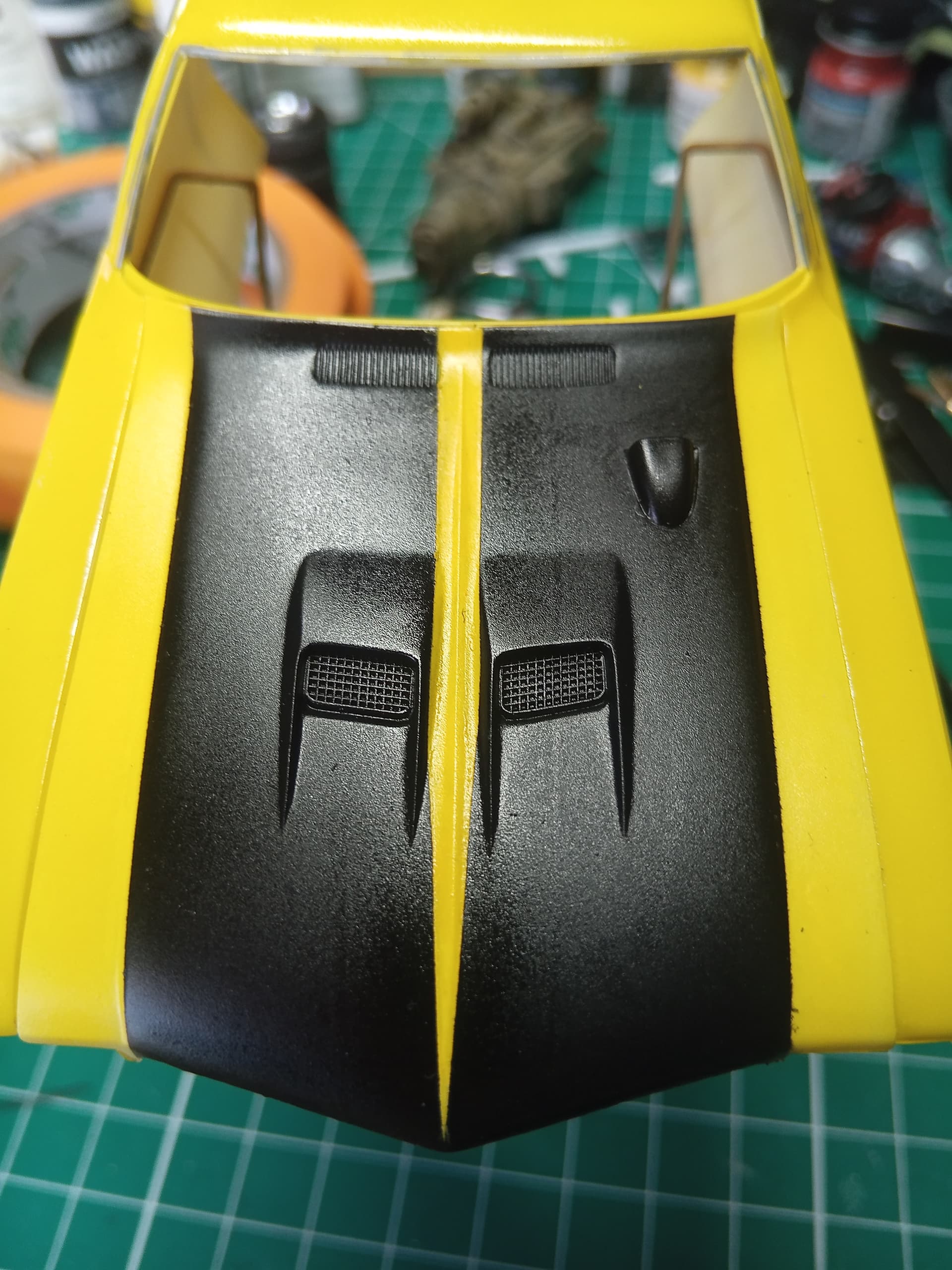 Okay, so I masked and painted the stinger on the hood and think it came out pretty good.