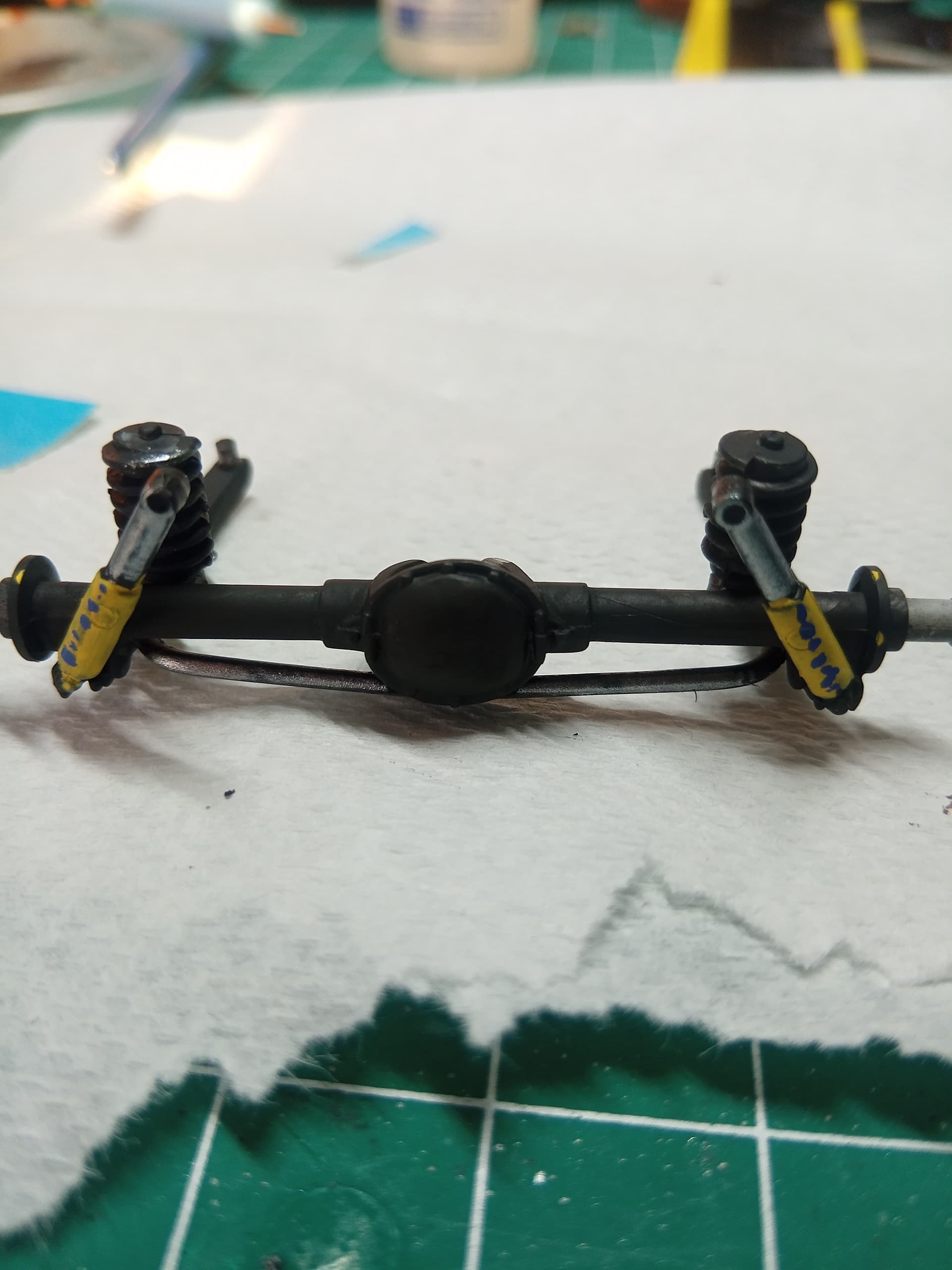 Worked on the chassis. The rear axle sub assembly and exhaust are not attached yet. Went with what I remember to be Munroe shock colors, yellow with blue logo. I don’t think you can quite see it in the picture though.
