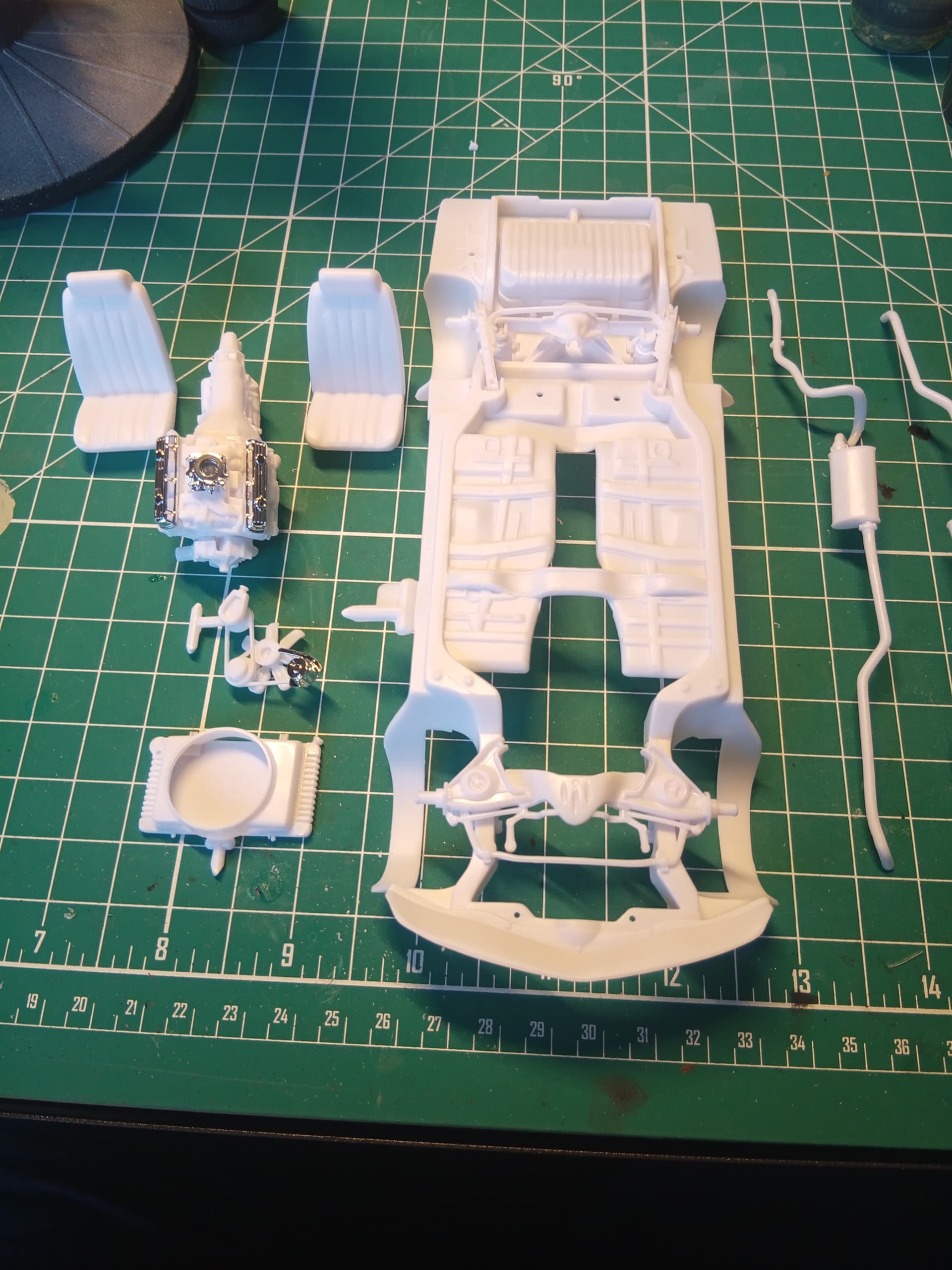 So, for this week, I was able to get some sub-assemblies done. Engine, suspension, front seats, radiator mount with fan shroud and fan/alternator belts. If the garage warms up enough I will try and prime everything. If not next week is supposed to be warmer.