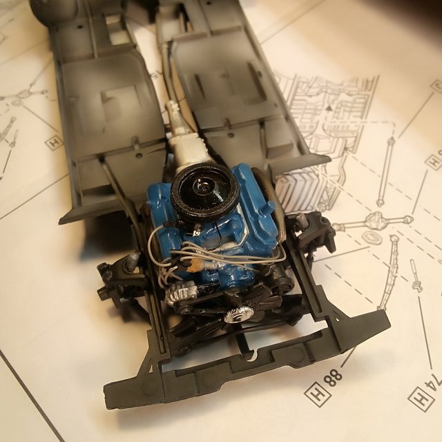 Working on this Dodge build while taking a break from the Chevelle’s. This kit was a 2-n-1 kit with the option for either a race version or street. I chose the street. Option is a 440 engine, which I painted Chrysler Engine Blue. It also has the option of a 426 Hemi. Revell also included an engine stand you can attach the unused engine for display.