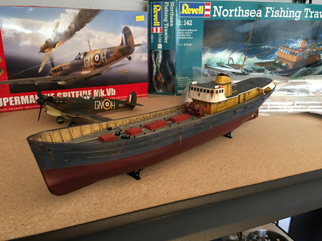 Well I completed the build. Biggest takeaway is that I need a bigger, better workbench. I may make one. I also need better lighting with a magnifying glass on it, I was really straining my eyes with this. Anyway, here’s my weathered, salty and rusty trawler. I like working with acrylic washes as it reminds me of watercolor painting. I was sort of rushing through this build as I’m not going to be able to spend time on kits for the next 3 weeks, nor do I want to think about them (vacation coming up), but I did spend a lot of hours on this in hindsight. Those life preservers were a pain to paint, and ended up using a finely sharpened toothpick a lot. On that note, my wife was impressed, saying she can barely paint her nails let alone something like those tiny life preservers. All in all I’m pretty happy with how it came out, and it looks better in person I feel.