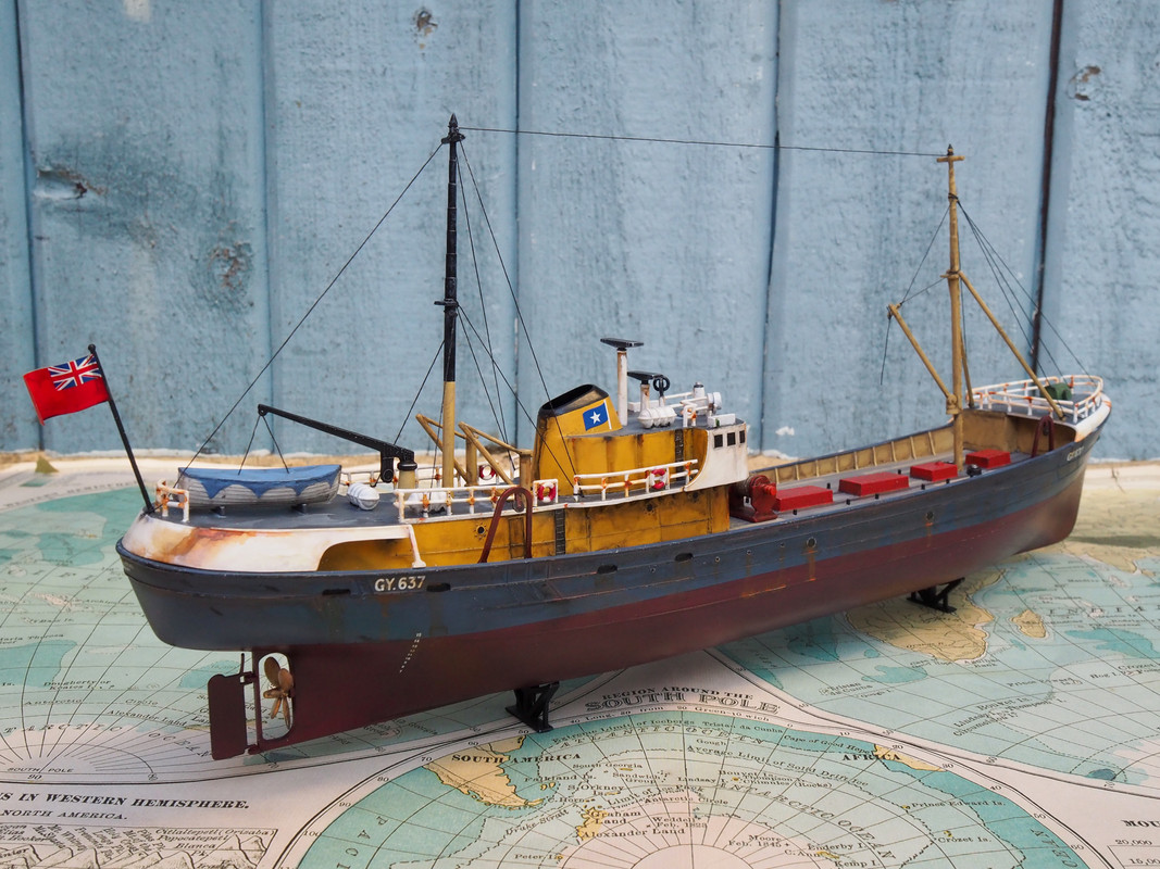 Shipspotting.com recently posted this photo of the British fishing trawler WYRE VANGUARD, built in 1955 and seen in this picture in September 1969 returning back to port at Fleetwood, England. Went to the breakers yard in 1981. This trawler looks like the finished model.