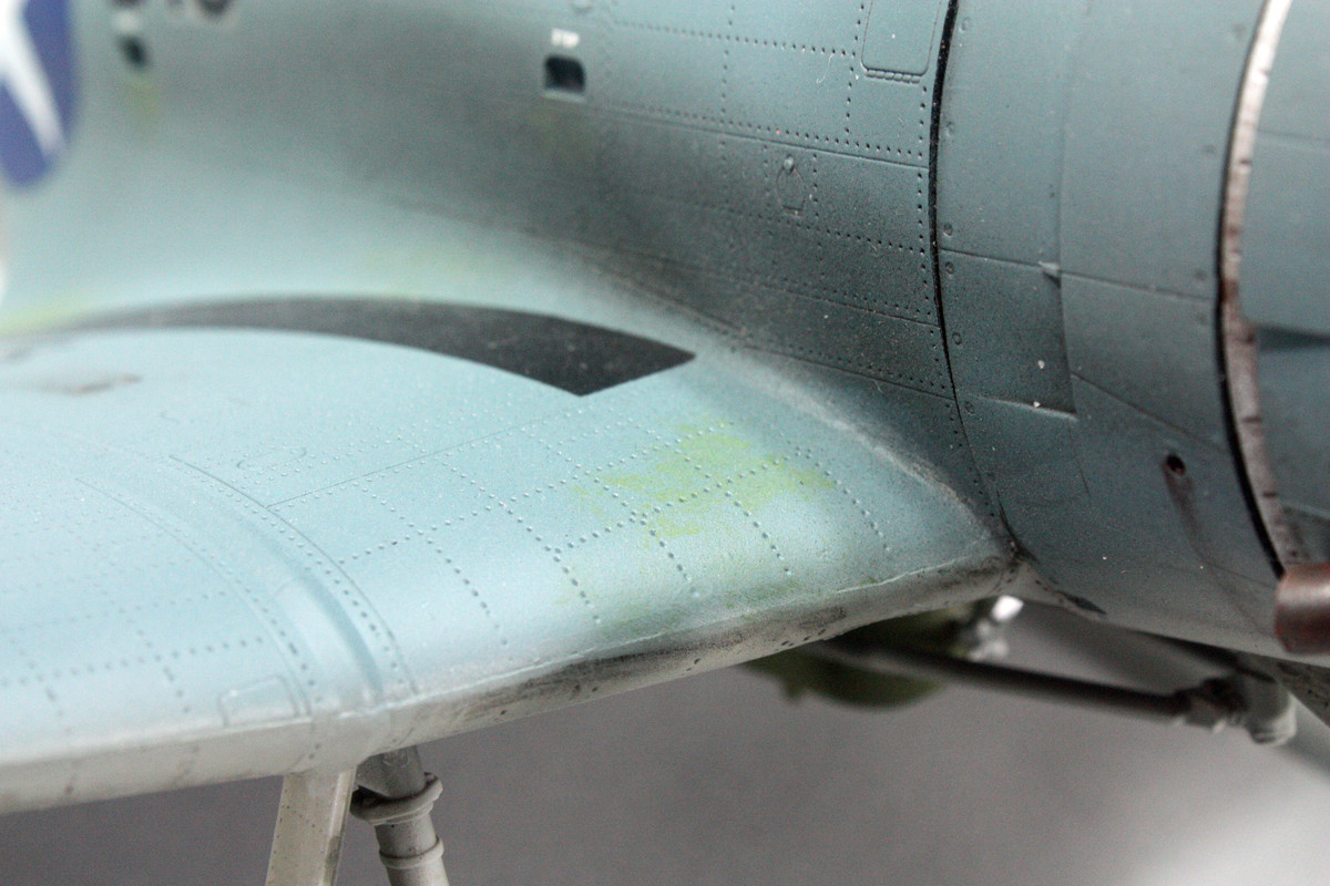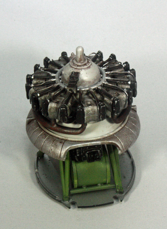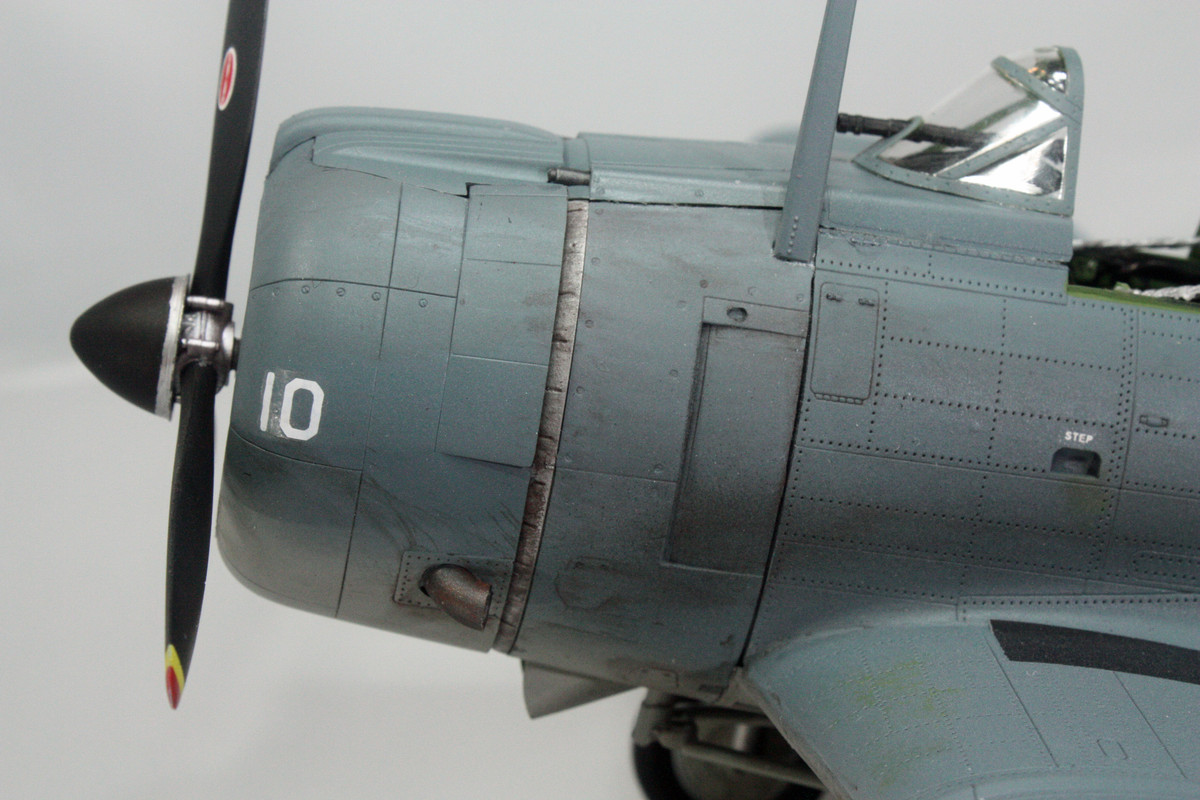 I started construction with the engine. I added .4mm lead wire for the ignition wires. I could not find anything definitive as to where the second wire in each tandem actually connected, so I wrapped it around to the backside. Midway Dauntless dive bombers tended to be the new SBD-3 models (the Navy began phasing out the SBD-2 following the Battle of the Coral Sea), so I figure the weathering should not be too obvious, but for the engine, I applied a bit of AK Interactive Streaking Grime followed by feathering with white spirit.