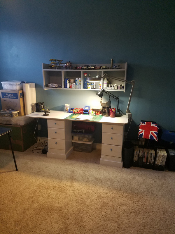 Not sure how organized this is but here is my little slice of heaven. Very limited space in my house so i converted an unused closet to be my work area. Cabinet on the left is an old bathroom cabinet. i try to keep it as neat as i can but im in the middle of a speed build right now so not all that neat.