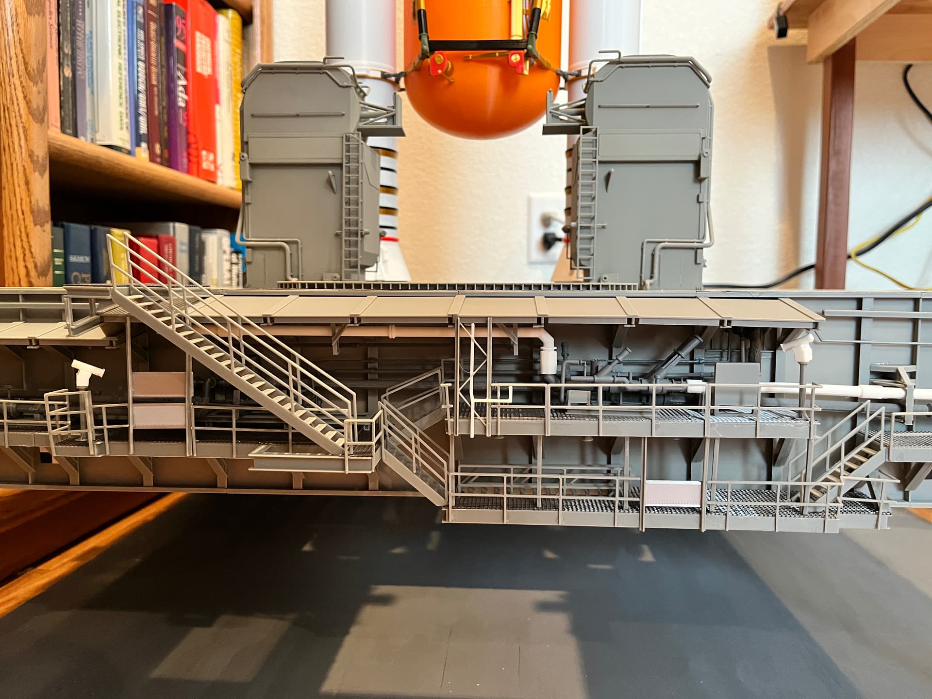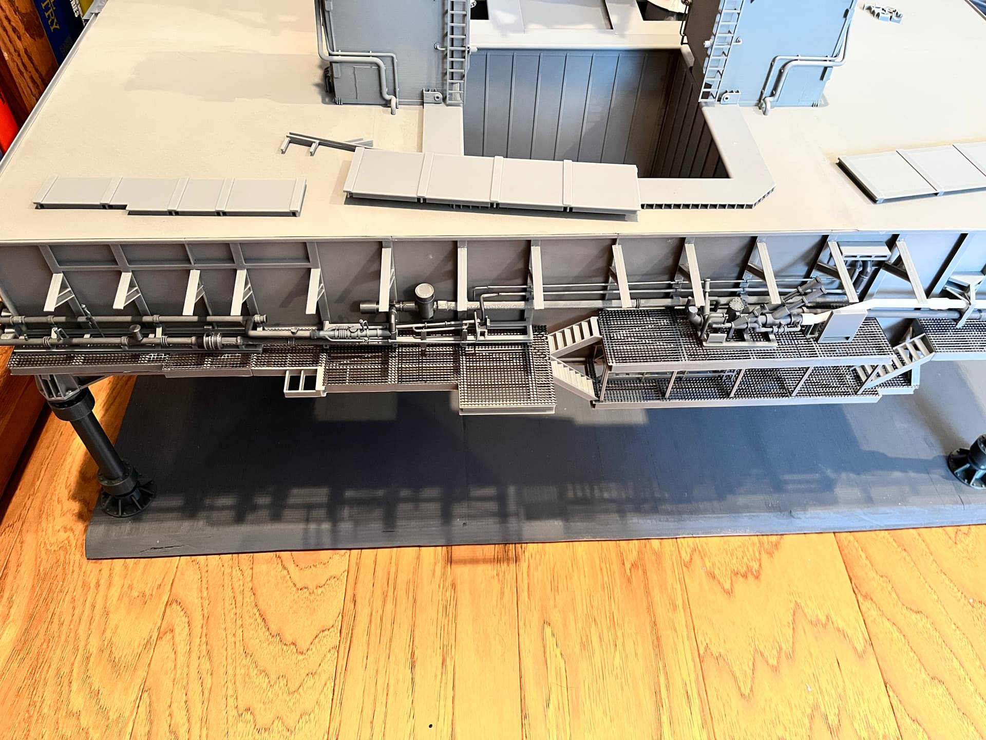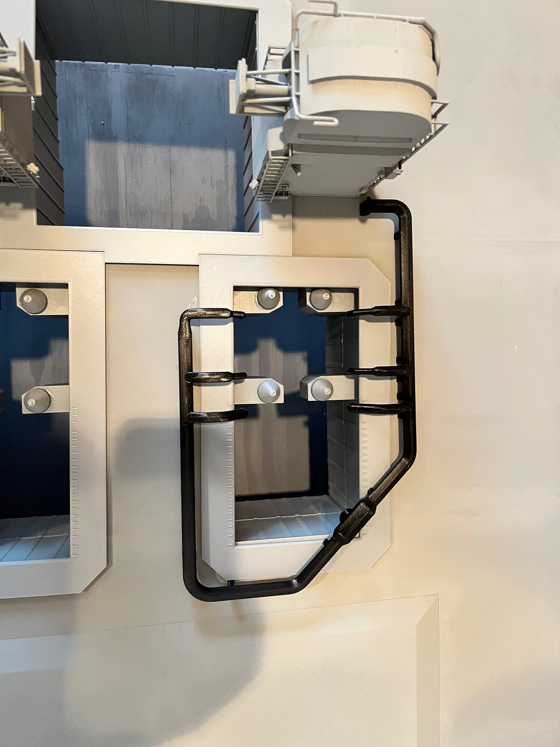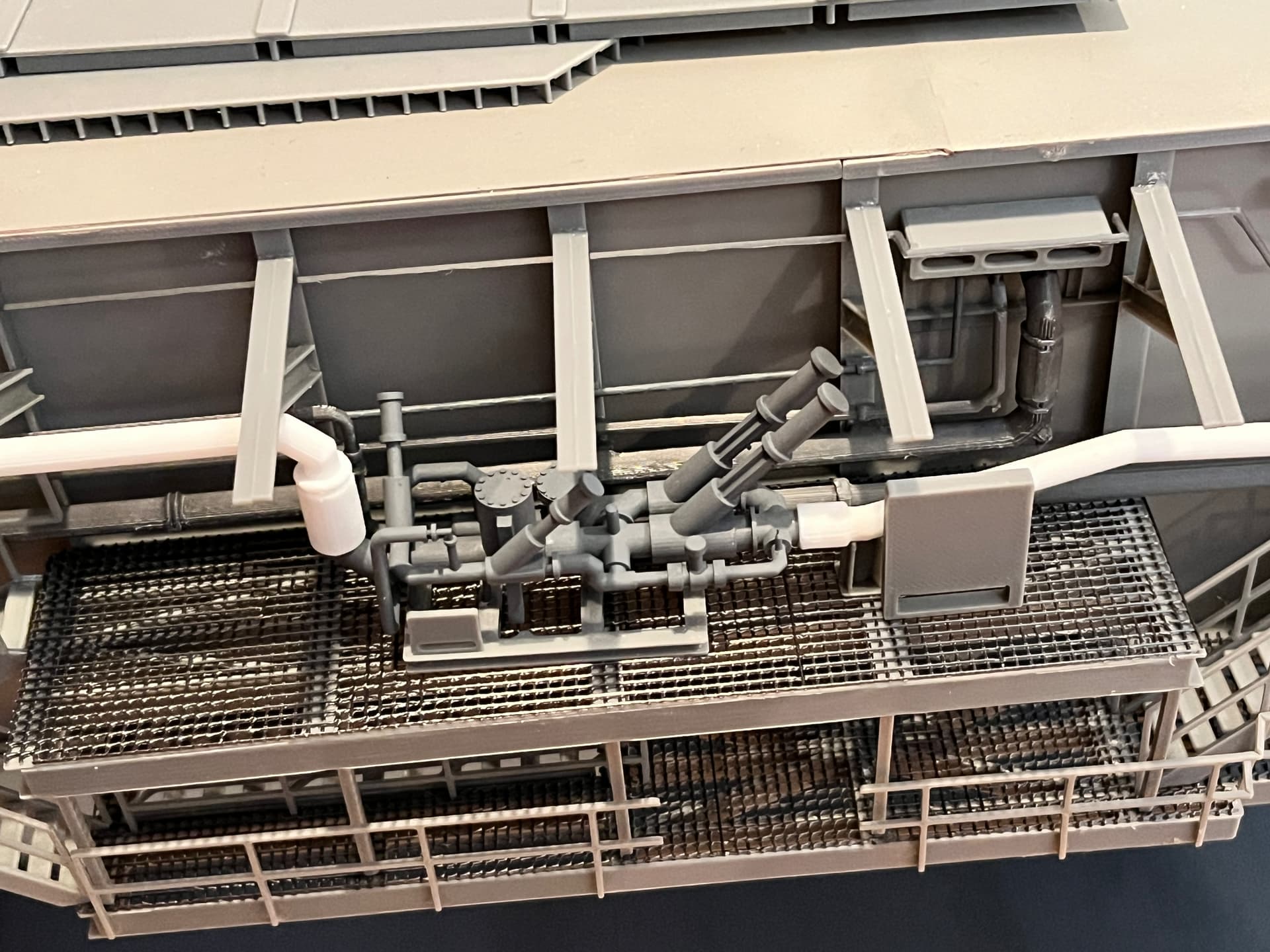 Near the middle is an MLP to SSAT interface. Once parked and on the piers, there would be a structure with stairs that you would use to access the top of the launcher. This is where the structure would connect, including a grate that goes over the gutter. This grating is the smallest, most delicate part I have made with the resin printer.