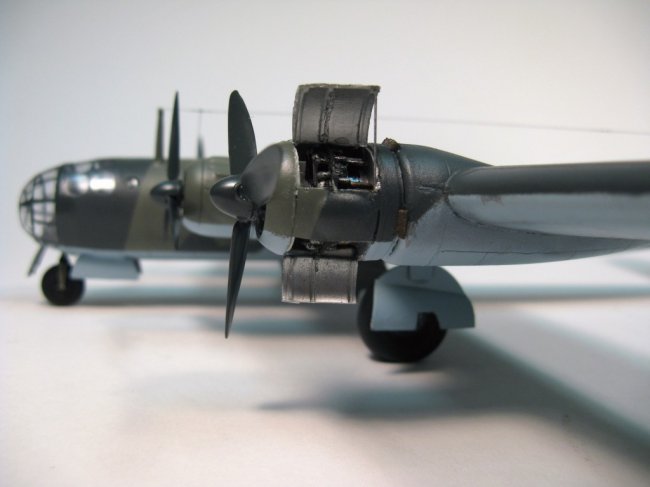 Finally, a pretty major problem with the kit exists that most would likely not even recognize. The kit is supposed to be a Me-264-V1 with Jumo 211J-1 inline engines, which are accurately represented, but the wingspan scales out a good bit too long. The wings actually scale more closely to the V2 model of the Me-264 that was fitted with BMW 801G radial engines. What to do? I did not find any aftermarket BMW 801G engines, so the only alternatives were to leave well enough alone or to do some wing tip surgery. I opted for the surgery. I sawed off about an inch off each wing tip and then fashioned new tips from plastic card and a lot of putty and sanding.