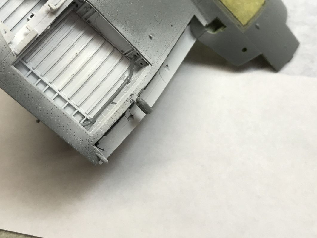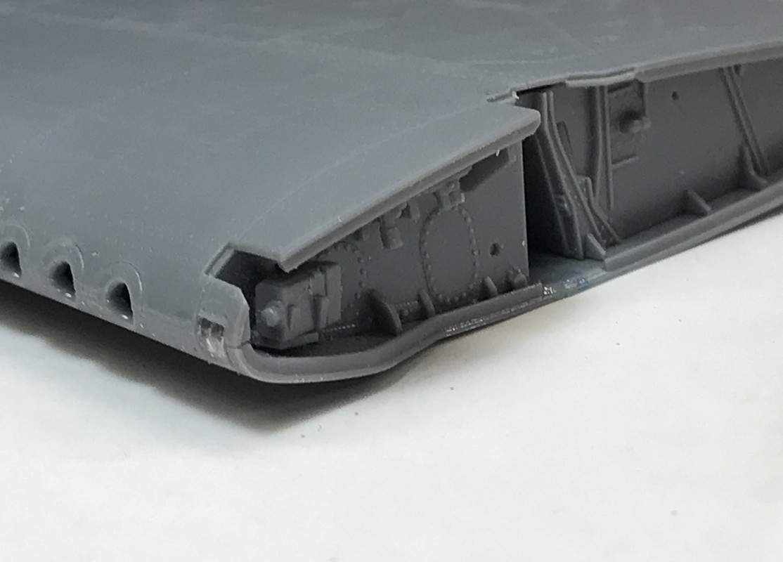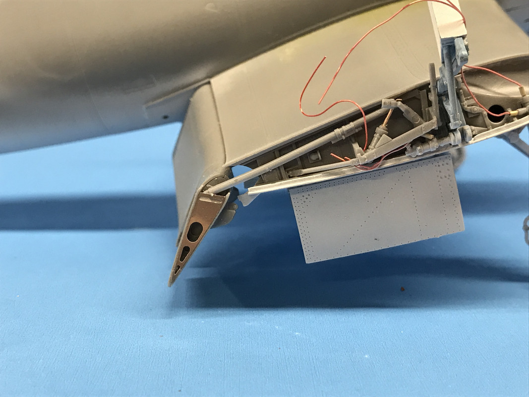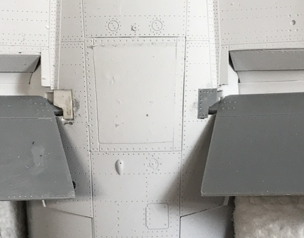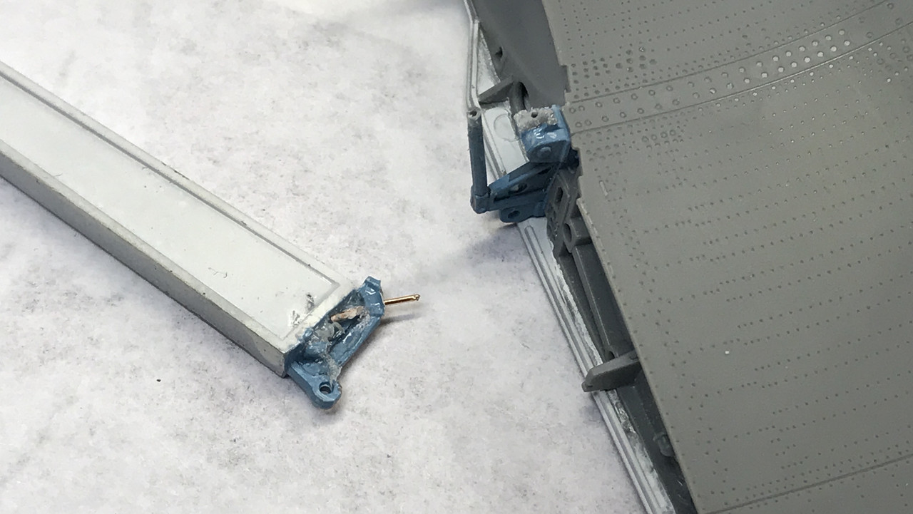 I test fit the right-side flap and carefully inserted the actuating rod into the notch behind the PE. It looks pretty good. The underside of these flaps too get painted white.