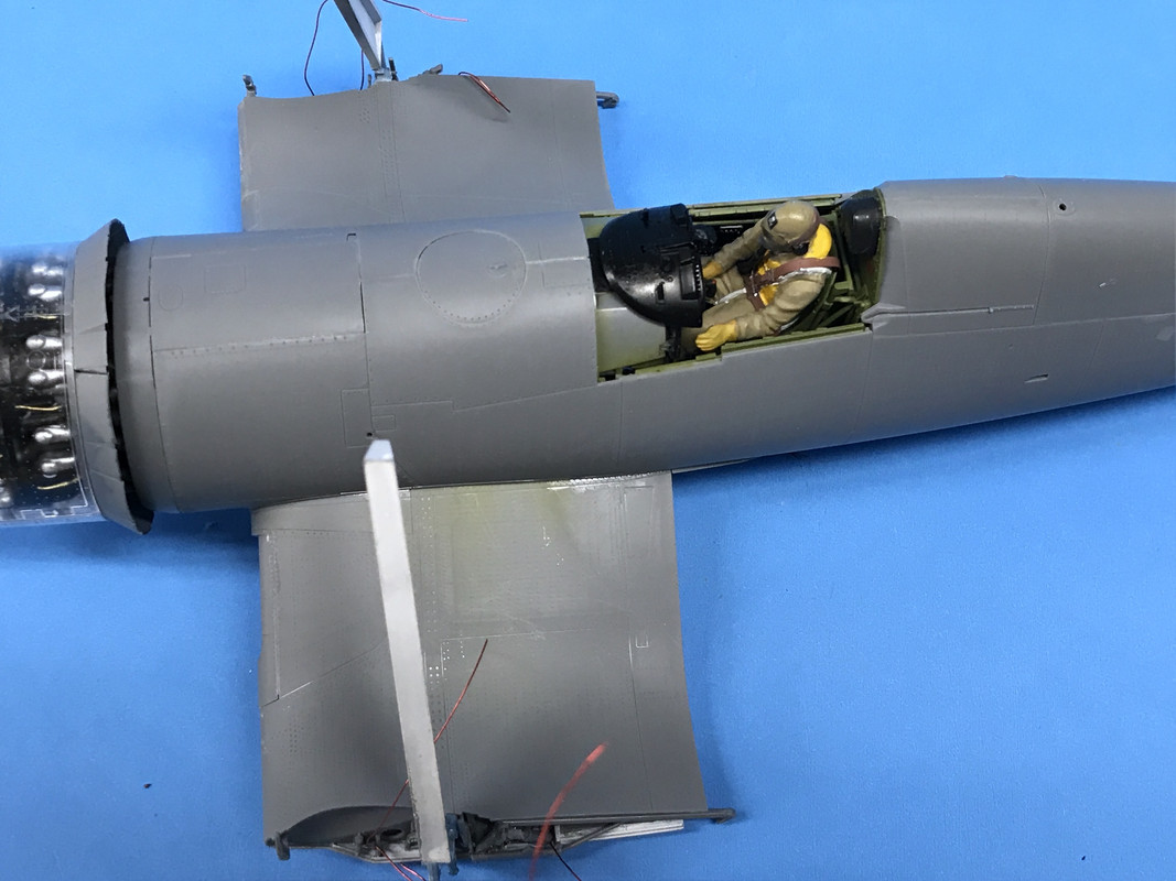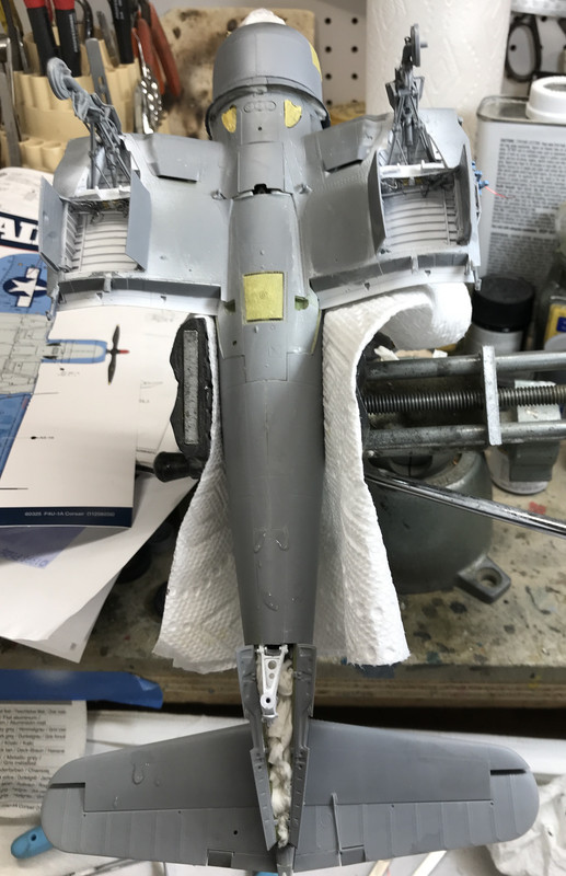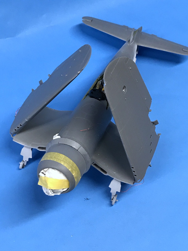 I’m still considering whether to use the transparent cowl or the solid one, so the solid one needs to be in place during the painting. While it snaps in place, it wasn’t holding tight enough to block paint from encroaching into the engine compartment so I put some liquid mask on the tabs and am holding it together with a rubber band until in dries. If this doesn’t work, I’ll wrap the engine underneath with some wet tissue and then put on the cowl. The Corsair has one of the busiest wing fold areas of any naval fighter that I know of complicated by the flaps being split.